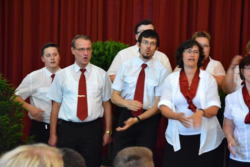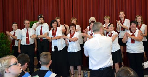 Unsere neuen Erfahrungen mit verschiedenen Choraufstellungen auf der Bühne haben sich bis in den Auftritt zur Abiturübergabe ausgewirkt. So standen die wenigen verbliebenen Männerstimmen zu Beginn bei „Locus iste” und dem „Einfache[n] Frieden” ebenso wie am Ende bei „Vem kann segla” und der Studentenhymne „Gaudeamus igitur” hinter den Sopranen. Bei „M.L.K.“, in dem wiederum Max Czoschke und Ellen Bendgens die Solostimme sangen und der Chorleiter als Tenor II aushalf, sowie dem gefühlvollen „Bridge over troubled water” standen wieder alle Stimmen von hoch nach tief nebeneinander. Neu und sicher beeindruckend war die Darbietung von „Bring me little water, Sylvie” mit der ausgeklügelten Kombination aus Bodypercussion und mehrstimmigem Gesang. An diesem Stück hatten sich die Teilnehmer des Musikkurses aus diesem Abiturjahrgang ebenfalls versucht. Hier konnten sie sehen, wie der Titel in voller Länge und im vollständigen Arrangement klingen kann.