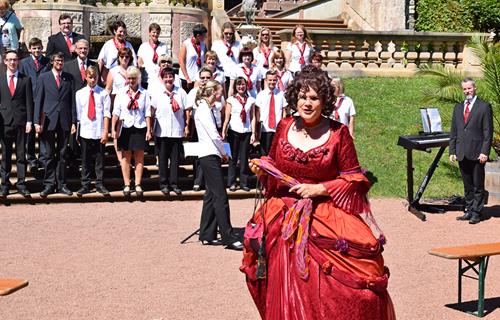 Nach zwei Jahren waren wir wieder beim Mittelsächsischen Sängertreffen dabei und konnten gleich zwei mal auftreten. Wir sangen als vierter Chor auf den Eingangsstufen zum Park und hatten somit Zeit, vorher den anderen Chören zu lauschen, zu fachsimpeln oder ein paar Pokémon zu fangen. Unter strahlend blauem Himmel und in der erquickenden Anwesenheit der Reichsgräfin Cosel boten wir einen kurzen Einblick in unser Repertoire. Dieser veranlasste offensichtlich nicht nur die anwesenden Zuschauer zu viel Applaus und Zugabe-Rufen, sondern auch den MDR, unseren Chor mit der Kamera einzufangen und am Abend ein paar bewegte Bilder dieses Auftritts im Sachsenspiegel auszustrahlen.