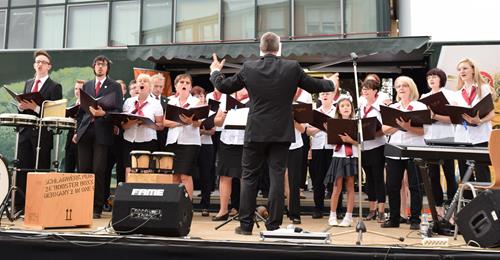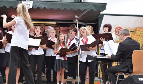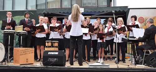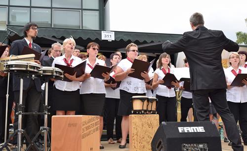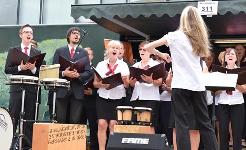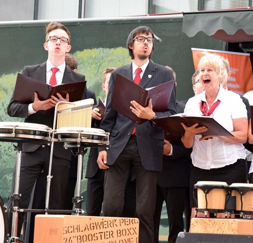 Gut präpariert standen wir auf der Regionalbühne und sangen unser „Wochenend und Sonnenschein“, um damit den Wettergott noch ein wenig zu besänftigen. Immerhin hatte der DJ vorher auf dieser Bühne „I like Chopin“ von Gazebo gespielt, in welchem es im Refrain ständig „Rainy days“ heißt. Dagegen kamen wir mit unserem Comedian-Harmonists-Titel offensichtlich nicht an.