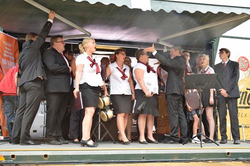 Denn wir gelangten gerade mal bis zum sechsten Titel unseres Programms und mussten dann, als der Regen wirklich zu strömen anfing, uns und die Instrumente unter das Minidach der Bühne retten, damit nicht beides stärker unter dem Wasser litt, als unbedingt notwendig. Das letzte Bild unter besagtem Hilfsdach zeigt, wie nass es war. Und es zeigt auch, dass uns selbst der Regen die gute Laune unseres Auftritts nicht verderben kann. So haben wir unter dem Dächlein noch ein, zwei a cappella-Stücke intoniert, bevor wir dann den trockenen Umkleideraum zu erreichen suchten, um uns und die Instrumente von der Feuchtigkeit zu befreien.