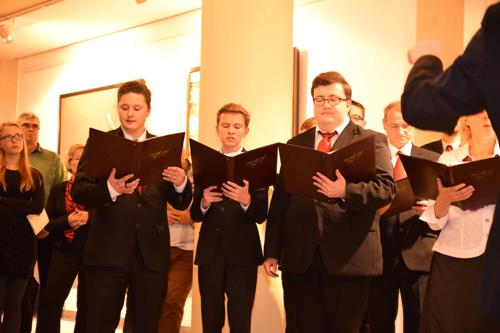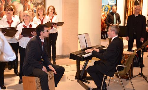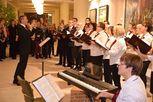 Schon beim Eingangsstück: „In dulci jubilo“ im Satz von Karl Jenkins, das wir mit Klavier und Bass-Cajon begleitet haben, wurde den Leuten plötzlich klar, dass Chormusik viel mehr sein kann als jahrhundertealte Lieder Strophe für Strophe gleich und althergebracht runterzusingen. „Gaudete“, das noch viel älter ist, haben wir in unserer eigenen Version im bis zu sechsstimmigen Satz, begleitet von Katrin auf der Trommel, gesungen und auch dafür bewundernde Blicke, heftigen Applaus und Nachfragen nach dem Satz erhalten. Letztendlich konnten wir mit dem Krippenspiel-Fragment, in dem wir in sechs verschiedenen Gruppen ein Quodlibet aus verschiedensten Weihnachtslieder-Versatzstücken mit zum Teil geänderten Texten darboten, die Begeisterung der Zuhörer noch einmal steigern, was für uns natürlich einen gelungenen Abgang darstellte.