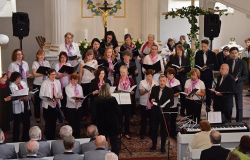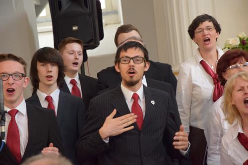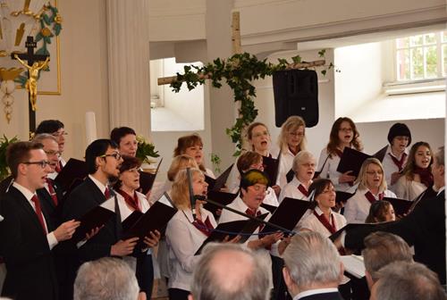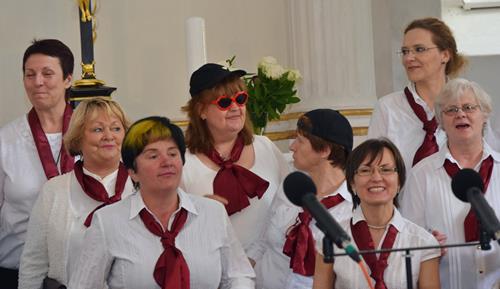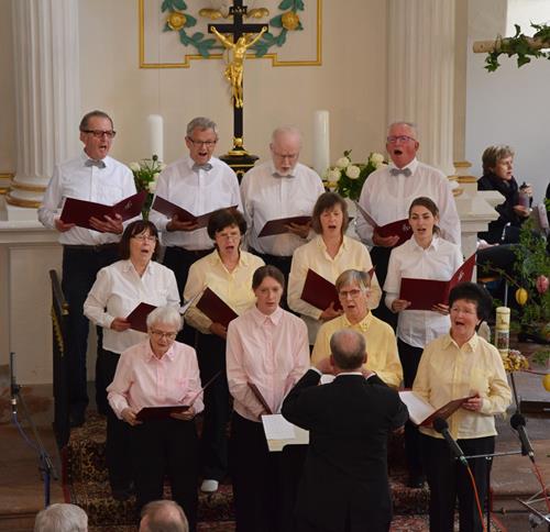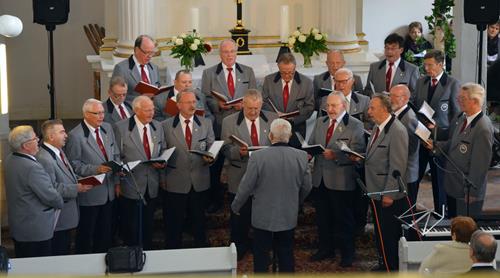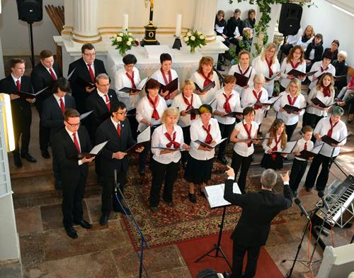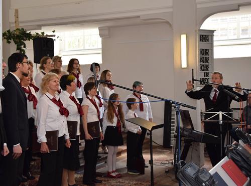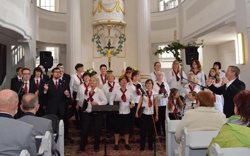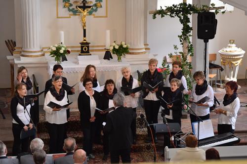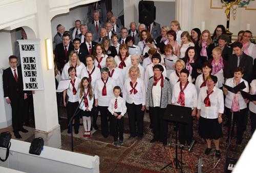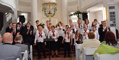 In drei verschiedenen Sprachen und mit der Zugabe des leicht anzüglichen Sprech-, Sing- und Rap-Kanons „Ode an den Spätwinter“ eröffneten wir den Chorreigen, der dann von drei weiteren Chören der Region fortgesetzt wurde. Den erfreulichen Abschluss gestaltete – und schloss damit den Bogen zum Programmbeginn durch uns – der Chor „Melodie“ aus der tschechischen Partnerstadt Lunzenaus Libochovice. Mit ihrem flotten und jugendlich frischen Programm hatten sie sofort die Herzen der anwesenden ca. 60 Besucher, und natürlich auch aller Sängerinnen und Sänger, auf ihrer Seite. Der stimmgewaltige Tenor und Co-Chorleiter trug ein beträchtliches Scherflein dazu bei, dass die Wogen der Begeisterung hoch schlugen. So war der gemeinsame Abschluss, zu dem alle fünf anwesenden Chöre eine tschechische Weise sowie den Kanon „Dona nobis pacem“ – letzteren sogar mit Beteiligung des Publikums – darboten, der logische Schluss- und akustische Höhepunkt des Programms.