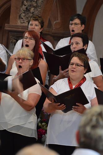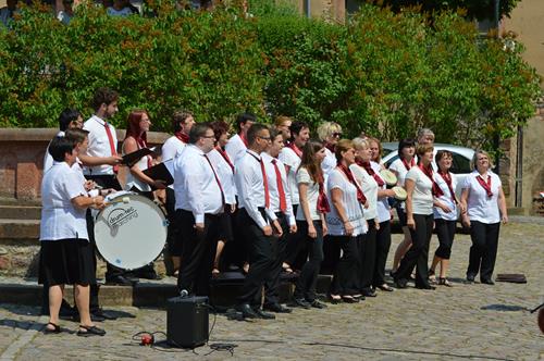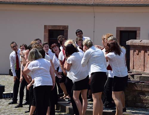 Für den 27.05.2018 hatte uns der Wechselburger Paul-Fleming-Chor eingeladen. Neben diesem und dem Volkschor Lichtenstein gestalteten wir ein sehr abwechslungsreiches und modernes Programm. Bei strahlendem Sonnenschein boten wir zunächst im Brunnenhof einige flottere Stücke dar, die wir z. T. auch choreografisch aufpeppten.