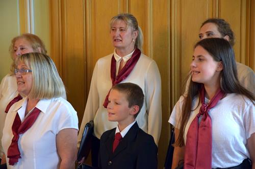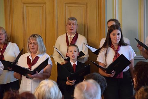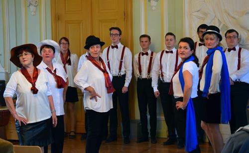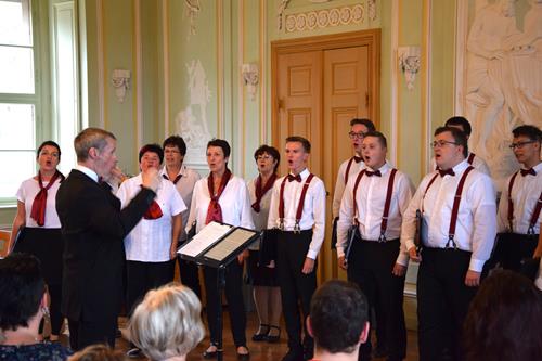 Einen großen Anteil am Gelingen des Konzertes hatten die Ensemblestücke mit ihren originellen Texten, bei denen die einzelnen Sängerinnen und Sänger ihre Freude am Singen besonders stark zum Ausdruck bringen konnten. Und vielleicht trug auch das neue Outfit unserer Tenöre und Bässe dazu bei. Der Kontrast der farblichen Zusammenstellung beeindruckt schon aus dem Augenwinkel – das Weiß der Hemden, so rein wie unsere Stimmen, das Bordeaux der Hosenträger und Fliegen, so leidenschaftlich wie ein guter Wein, und das Schwarz der Hosen und Schuhe, so bodenständig wie unsere Chor-Gemeinschaft, das fügt sich harmonisch in das Ambiente unserer Auftrittsorte. Und hier war es nun das erste Mal, dass wir dieses dem Publikum präsentieren konnten. Jugendlicher, auf jeden Fall legerer und frecher im Vergleich zu den schwarzen Anzügen bei festlichen Konzerten.