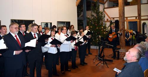 17:30 Uhr war dann unser Auftritt. In der gut beheizten, hell erleuchteten und bis zum letzten Platz gefüllten Haferscheune boten wir ein Weihnachtsprogramm, bei dem viel zu sehen und zu hören war, auch mehrere Titel mitgesungen werden konnten. Auch der gitarrenbegleitete „Gesang der Engel“ war neben „Mid-Winter“ als Novum wieder mit dabei. Aber vor allem ging es um ruhige, besinnliche und weitere kleine und zarte Momente, die mitunter in der hektischen Vorweihnachtszeit etwas in Vergessenheit geraten könnten.