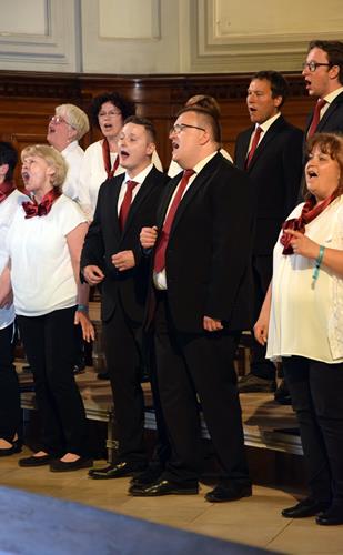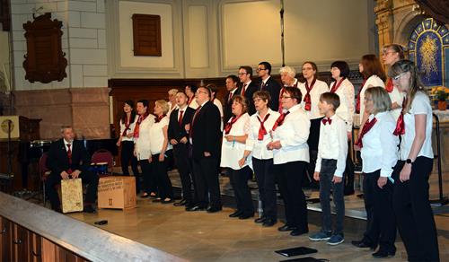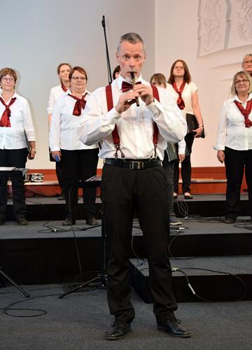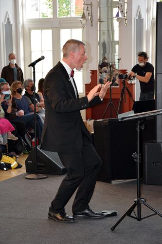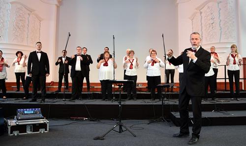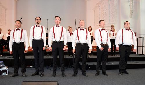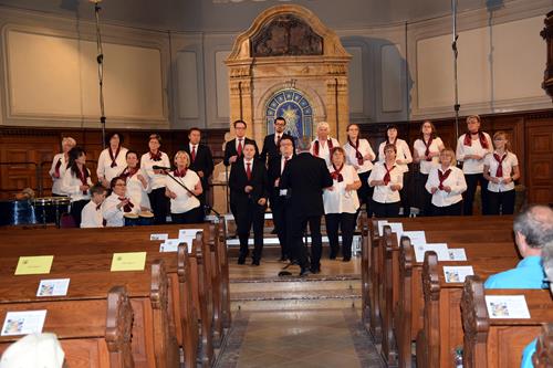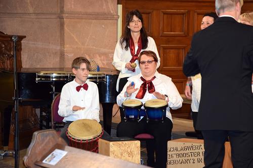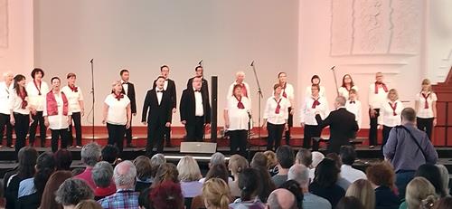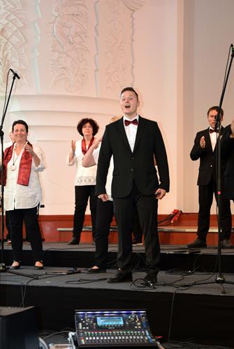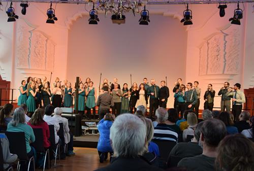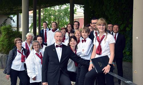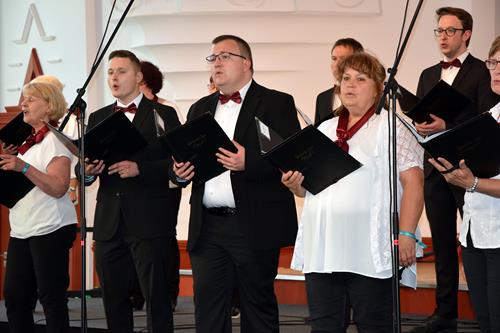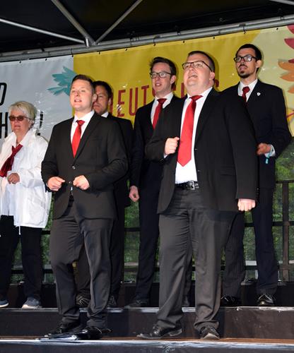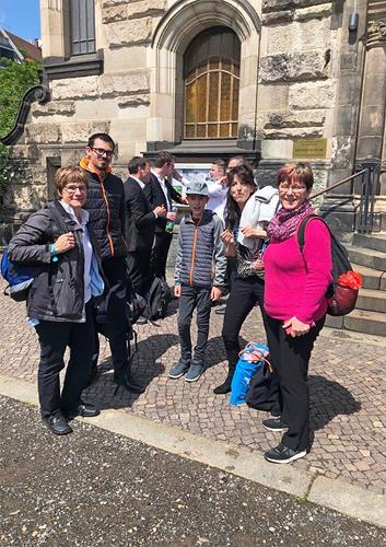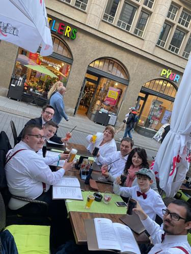 Unser erstes Tageskonzert sangen wir am Freitag in der Michaeliskirche, wozu wir uns draußen vor der Kirche trafen und einsangen. Nur wenige Stunden später traten wir im Rahmen des Verbandskonzerts „Saggsn gruufd“ im weißen Saal der Kongresshalle, direkt am Zoo, auf. Dort konnten wir uns natürlich in der unteren Etage einsingen und mussten nicht mehr mit den Pollen kämpfen. Hier traten unsere Männer wieder mal mit der „Ode an die Heimat“ auf, hatten sich dafür extra in ein legereres Outfit begeben und sorgten mit dem herrlichen Maybebop-Text für so manchen Schmunzler oder gar herzhaften Lacher im Publikum.