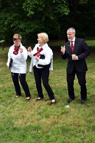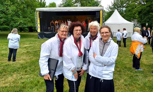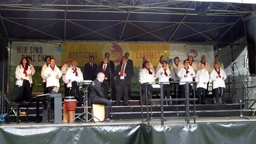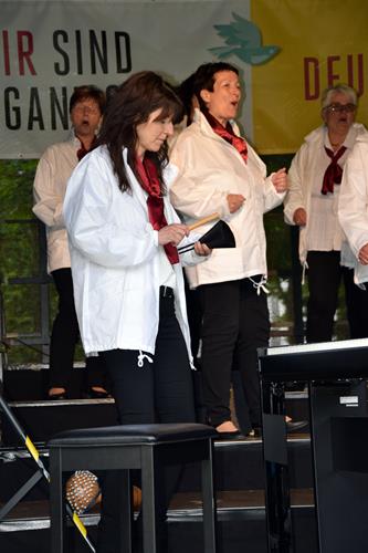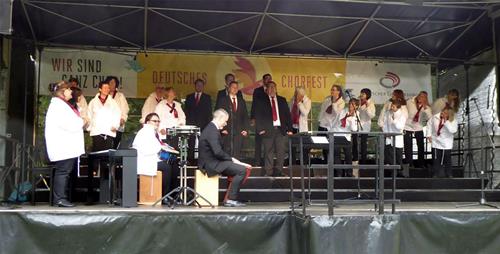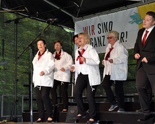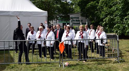 Am Samstag früh, 10:30 Uhr waren wir dann noch einmal mit unserem Tageskonzert zu hören, diesmal jedoch im Freien: auf der AOK-Wiese des Clara-Zetkin-Parks, wo wir nicht nur einen anderen Chor kennenlernen konnten, sondern tatsächlich auch zu so früher Stunde schon etliche Gäste, die den Chören aufmerksam und freudig lauschten, begrüßen konnten. Die hervorragende Tontechnik hat das Ihrige dazu beigetragen, dass das Hörerlebnis vor der Bühne nicht getrübt wurde.