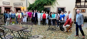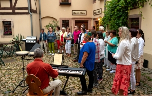 Bei leicht regnerischem Wetter boten wir eine reichliche halbe Stunde Poppiges und Gefälliges aus Vergangenheit und Gegenwart dar und erhielten dafür nicht nur viel Applaus, sondern es wurde auch viel mitgeklatscht, mitgeschnipst und sogar mitgesungen. Und nach der Veranstaltung bekamen wir noch viele positive Rückmeldungen, wie überraschend gut den geladenen Gästen unser Programm gefallen hat.