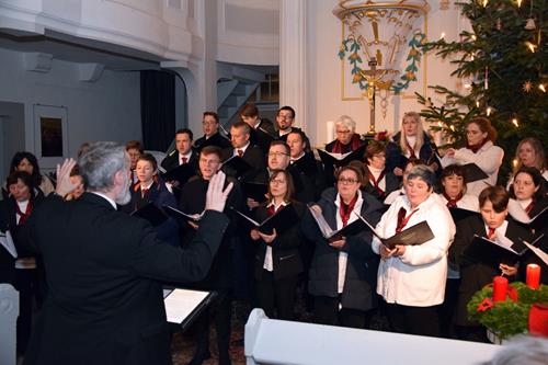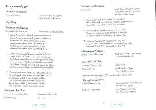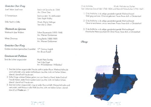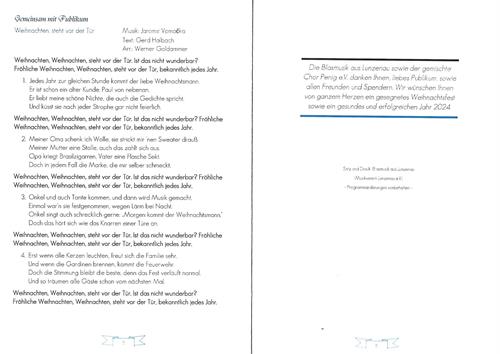 Wir waren dieses Jahr wieder mit dabei und konnten den Auftritt gemeinsam mit dem Blasorchester Lunzenau bestreiten. In einem einstündigen Programm wechselten sich das Orchester und unser Chor mit den Darbietungen ab. Fünf ausgewählte und extra dafür geprobte Musikstücke wurden sogar gemeinsam vorgetragen. Die Bläser oben auf der Orgelempore und wir Sänger und Sängerinnen im Altarraum fügten ihre Klänge zu einem besonderen und mitreißenden Hörerlebnis zusammen. Das zahlreiche Publikum konnte oft in die Lieder einstimmen, nicht zuletzt auch dank des aufwändig und liebevoll gestalteten Programmheftes, das Michael Baldauf, der Leiter des Blasorchesters, angefertigt hatte.
