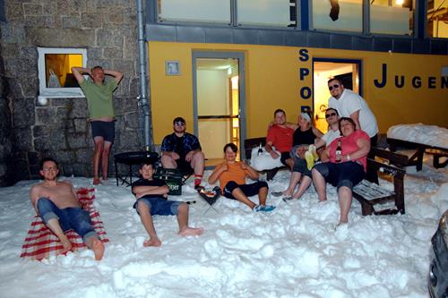 Aber natürlich kam auch die gemeinsame Freizeit nicht zu kurz, auch wenn das im wahrsten Sinne des Wortes überraschend hereingeschneite Winterwetter die eigentlichen Pläne etwas durcheinandergewirbelt hatte. So flogen neben Tischtennisbällen beim abendlichen Tischtennisspiel tagsüber auch einige Schneebälle oder es wurden Schneemänner gebaut. Einige unserer Sänger und Sängerinnen waren besonders tapfer und stellten sich trotz der winterlichen Temperaturen für ein sommerliches Fotoshooting mit Grill und kurzen Hosen zur Verfügung. Eine heiße Dusche zum Aufwärmen stand ja glücklicherweise bereit. Ein Riesenspaß für alle Teilnehmer und Zuschauer!