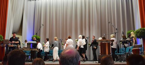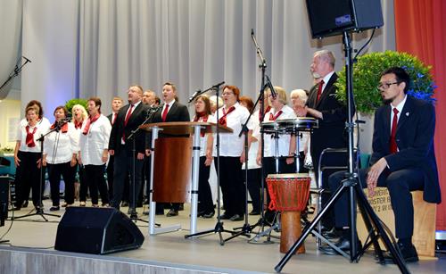 Die 16 Schulabsolventen der 12. Klasse schritten in ihren hübschen Kleidern und Anzügen zu „Adiemus“ klangvoll umhüllt in den Saal und zu ihren Plätzen. Zwischen den rückblickenden, zukunftsweisenden und dankenden Reden der Direktorin, des Bürgermeisters und der Schüler sangen wir mit „I still haven't found what I'm looking for“ und „Goodbye with a smile“ den jeweils passenden Titel zum Programm der Festveranstaltung. Für ein Schmunzeln konnten wieder unsere Männer mit ihrer „Ode an die Heimat“ sorgen, spricht das Lied doch von einem der Jugend sehr wohl bekannten „Verbindungsproblem“.