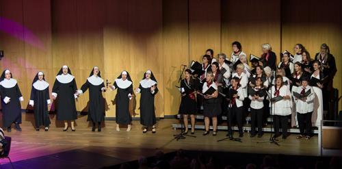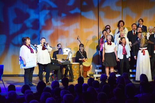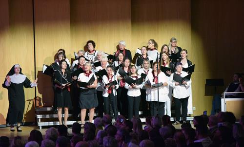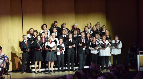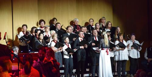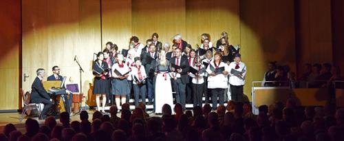 Unser Chor war bei den Liedern „I will follow him.“ (Sister Act) und „Wer hat an der Uhr gedreht“ (Der rosarote Panther) beteiligt und wir präsentierten zum Dirigat von Charleen Giesen solo die Titel „The Lion sleeps tonight“ (König der Löwen) und „Adiemus“, ein erfolgreiches Musikprojekt von Karl Jenkins und bekannt als Werbesong. „Adiemus“ – schon seit vielen Jahren fester Bestandteil unseres Repertoires – wird gerade auch durch seine instrumentale Begleitung von Piano, Basstrommel, Djembe und Becken zu einem raumfüllenden und gänsehauterzeugenden Hörerlebnis. Durch einige plötzliche Krankheitsausfälle mussten für diesen Titel zwei Rollen im Chor spontan neu besetzt werden. Unsere Altistin Katrin Ittner lernte kurzerhand das Spielen der Djembe und der Schlagzeuger des Akkordeon-Orchesters sprang am Becken ein. Eine gelungene Rettungsaktion. Unser Chorleiter, Ralph Wollny, der nach längerer, gesundheitlich nötiger Abwesenheit endlich wieder bei einem Auftritt mit dabei sein konnte, war sichtlich stolz und zufrieden mit der Präsentation seiner Sängerinnen und Sänger.