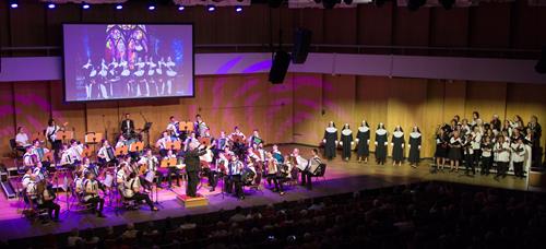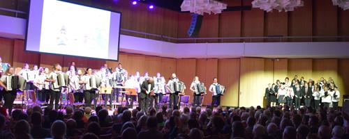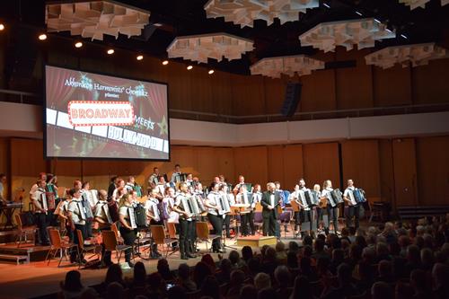 Wie der Veranstaltungstitel des Konzertes schon sagte, wurden an diesem Nachmittag bekannte Stücke aus Musicals und Filmen von circa 30 Akkordeonspielerinnen und -spielern gemeinsam mit ihrem Drummer, einer Gitarristin und einer Keyboarderin dargeboten. Man mag ja wissen, wie EIN Akkordeon klingt, aber was viele Musiker zusammen mit diesem Instrument an Klang und Stimmung erzeugen können, ist einfach nur beeindruckend! Die herzliche Moderatorin führte schwungvoll durch das Programm und die Sängerinnen des Studios W.M. lieferten stimmliche Perfektion zu vielen wunderschönen Melodien.
