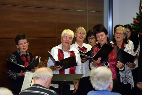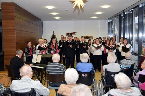 Wir verteilten unsere musikalischen Geschenke an das aufmerksam lauschende Publikum, zu denen auch Betreuer und Helfer zählten. Dabei versprühten wir ein wenig vorweihnachtlichen Zauber und weckten sicher auch Erinnerungen. Bei Liedern wie „Maria durch ein Dornwald ging“ oder „Es ist ein Ros entsprungen“ flogen die Gedanken der älteren Damen und Herren der Einrichtung bestimmt in die Vergangenheit, in viele erlebte Feste unterm Tannenbaum, in den damaligen Duft und Klang der Feiertage. Bei „Stille Nacht, heilige Nacht“ und dem Titel „Sind die Lichter angezündet“, der wohl zu Recht zu einem der beliebtesten und bekanntesten Weihnachtslieder der letzten Jahrzehnte geworden ist, wurde sogar mitgesungen. Welch Freude auch für uns!