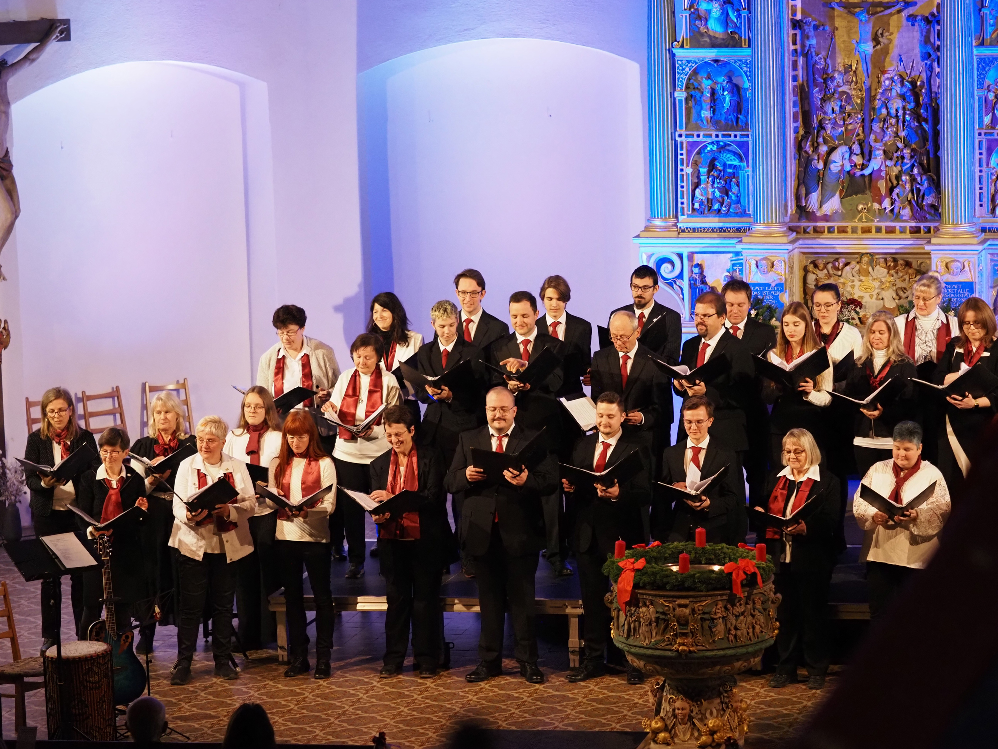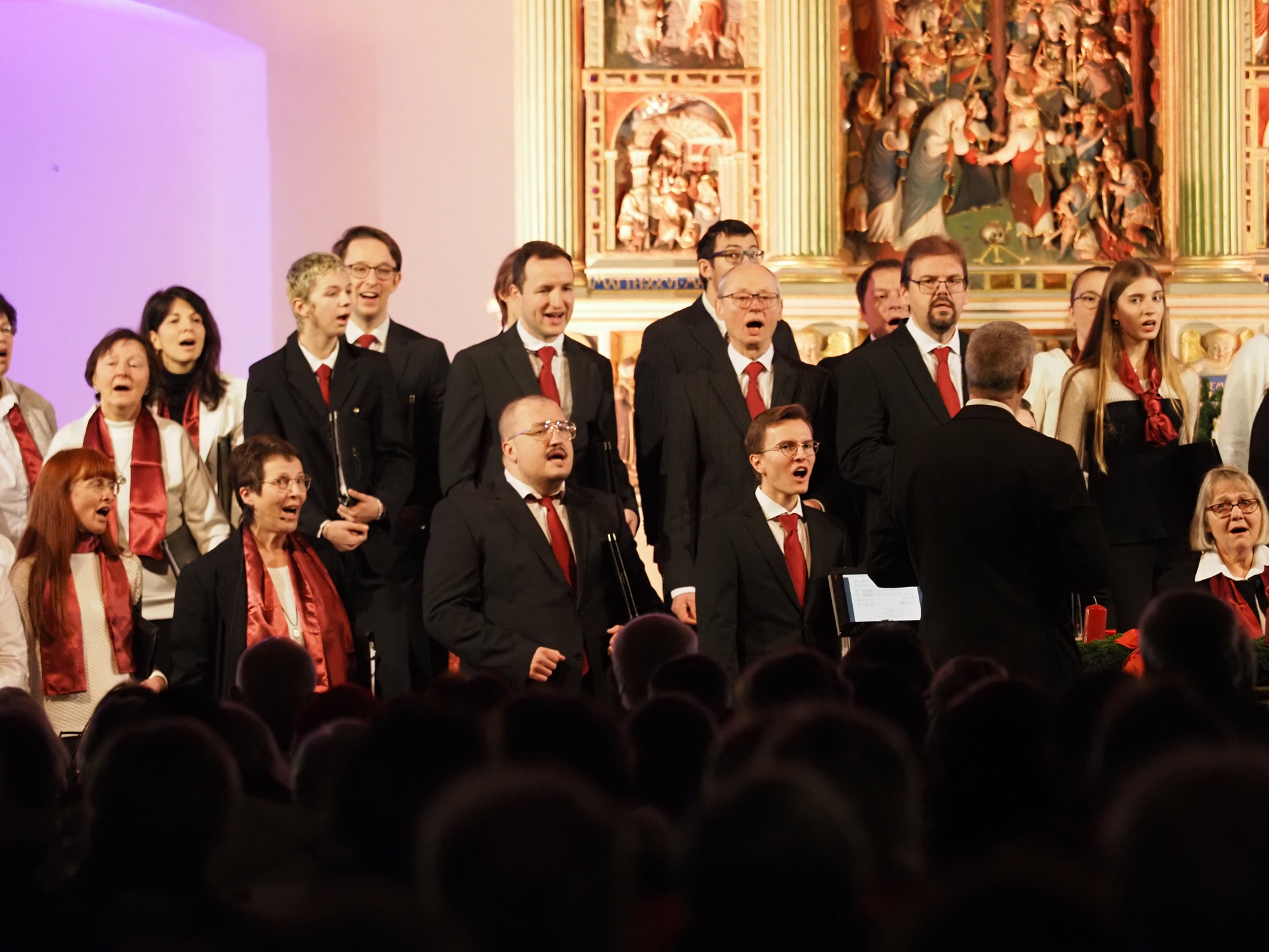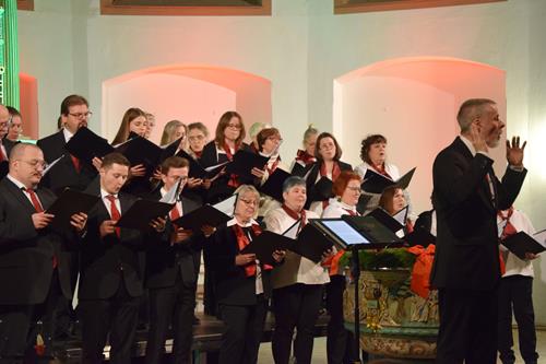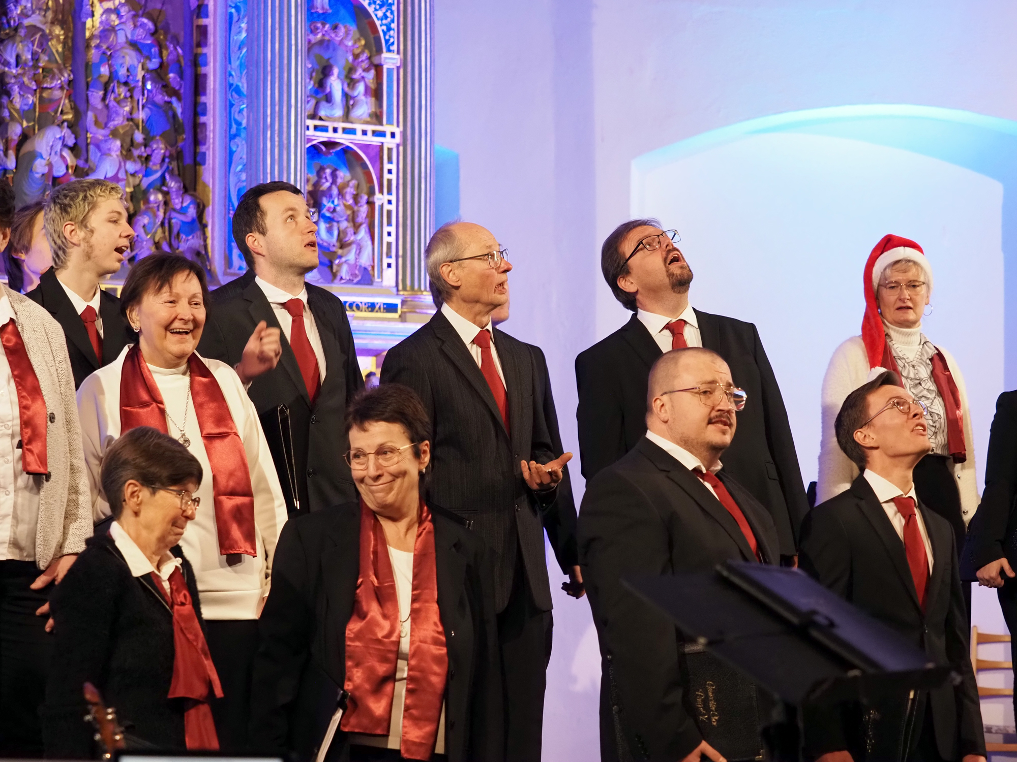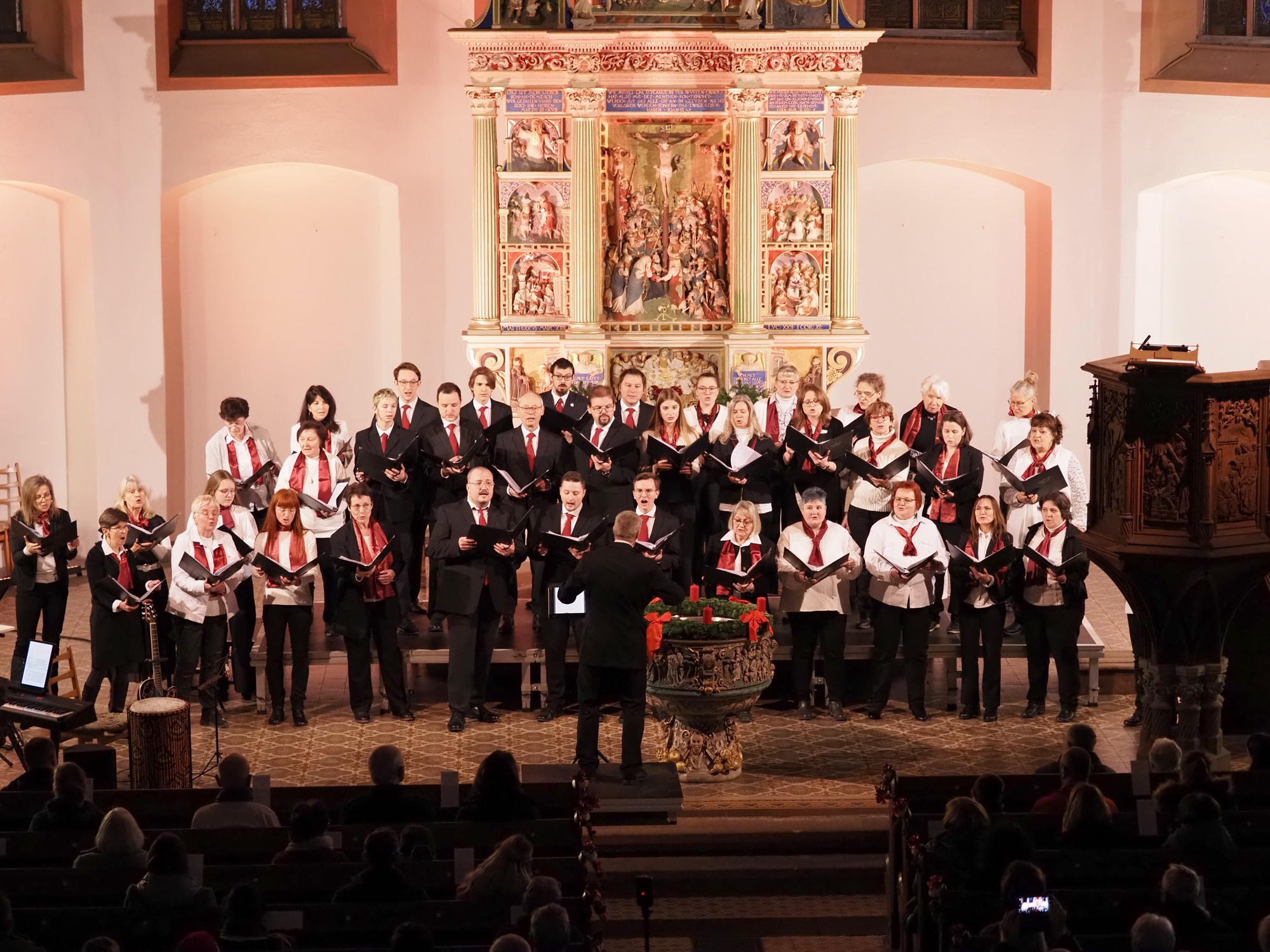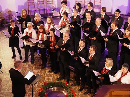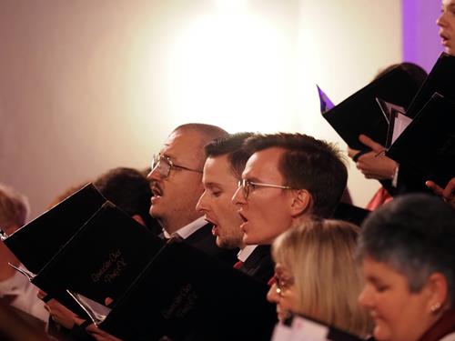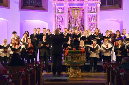 Das Konzertprogramm bot eine abwechslungsreiche Mischung aus Ensemblestücken, einem Gitarrenstück von unserem Bass-Sänger Marius, instrumental begleiteten Liedern, stimmungsvollen Kanons wie „Ding dong bells“ – bei dem das Publikum fröhlich mitsang – und natürlich vielen a cappella vorgetragenen Melodien. Neben bekannten Klassikern wie „Tausend Sterne sind ein Dom“ oder „Da pacem domine“ sorgte besonders unser neu einstudierter Chorsatz von „O Tannenbaum“ in einem Arrangement von Martin Carbow für Begeisterung. Als der letzte Ton verklungen war, würdigte das Publikum den Abend mit stehenden Ovationen. Die Stimmung gipfelte in einer gemeinsamen Zugabe: „Sind die Lichter angezündet“ – ein berührender Moment des Miteinanders, der den Abend unvergesslich machte.