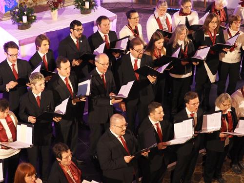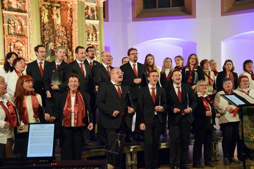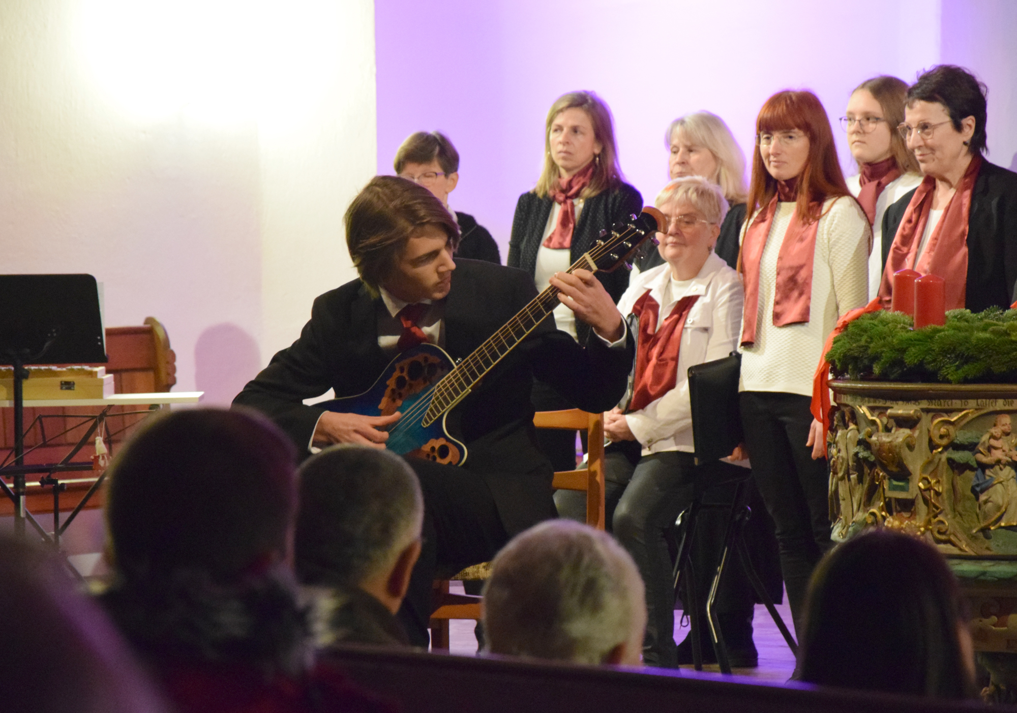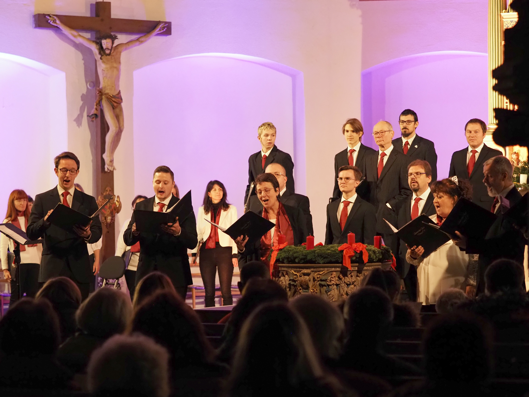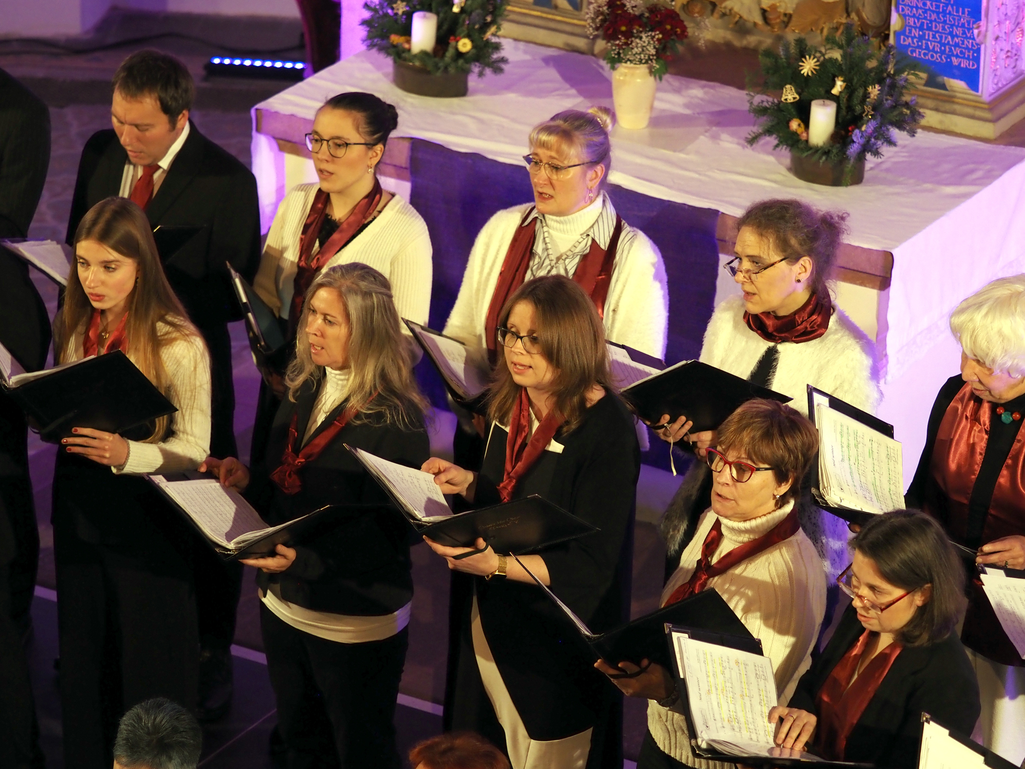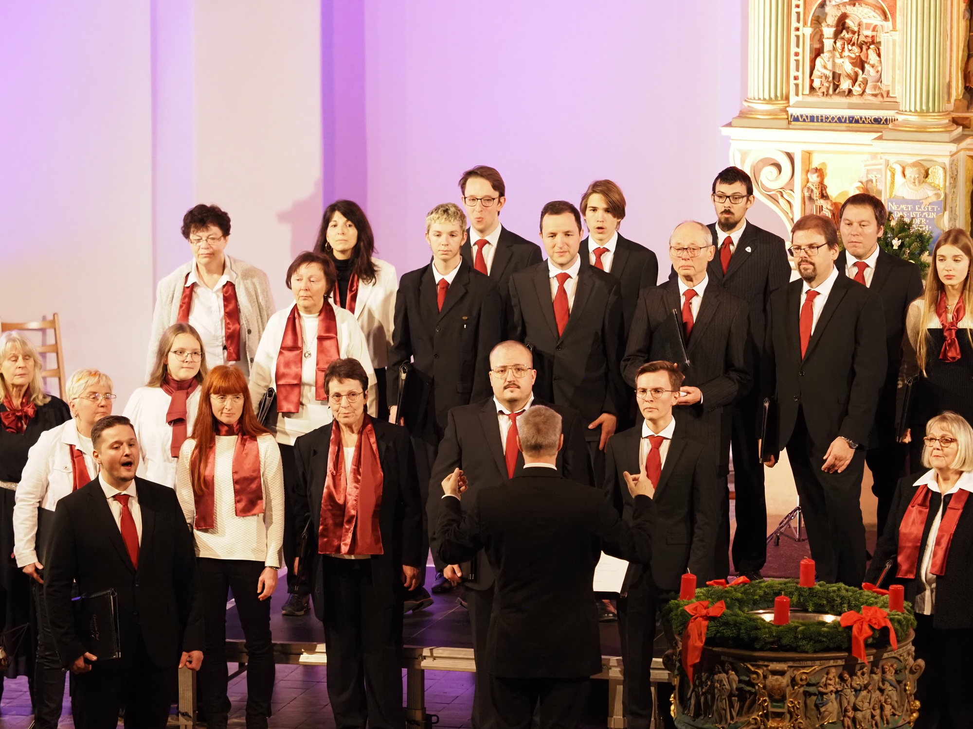 Das Konzertprogramm bot eine abwechslungsreiche Mischung aus Ensemblestücken, einem Gitarrenstück von unserem Bass-Sänger Marius, instrumental begleiteten Liedern, stimmungsvollen Kanons wie „Ding dong bells“ – bei dem das Publikum fröhlich mitsang – und natürlich vielen a cappella vorgetragenen Melodien. Neben bekannten Klassikern wie „Tausend Sterne sind ein Dom“ oder „Da pacem domine“ sorgte besonders unser neu einstudierter Chorsatz von „O Tannenbaum“ in einem Arrangement von Martin Carbow für Begeisterung. Als der letzte Ton verklungen war, würdigte das Publikum den Abend mit stehenden Ovationen. Die Stimmung gipfelte in einer gemeinsamen Zugabe: „Sind die Lichter angezündet“ – ein berührender Moment des Miteinanders, der den Abend unvergesslich machte.