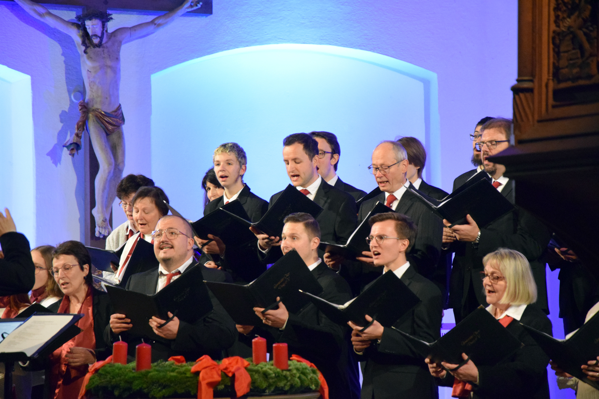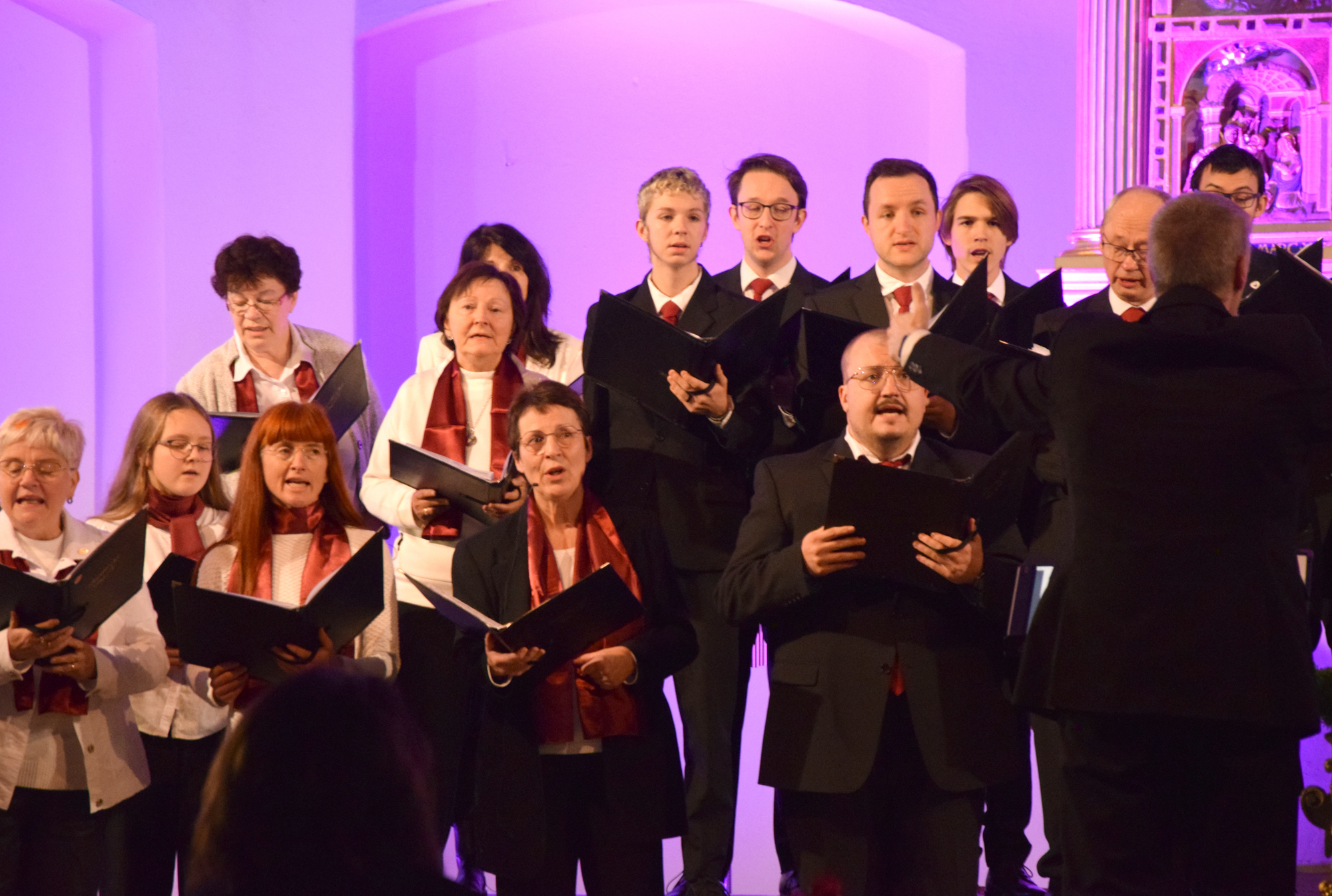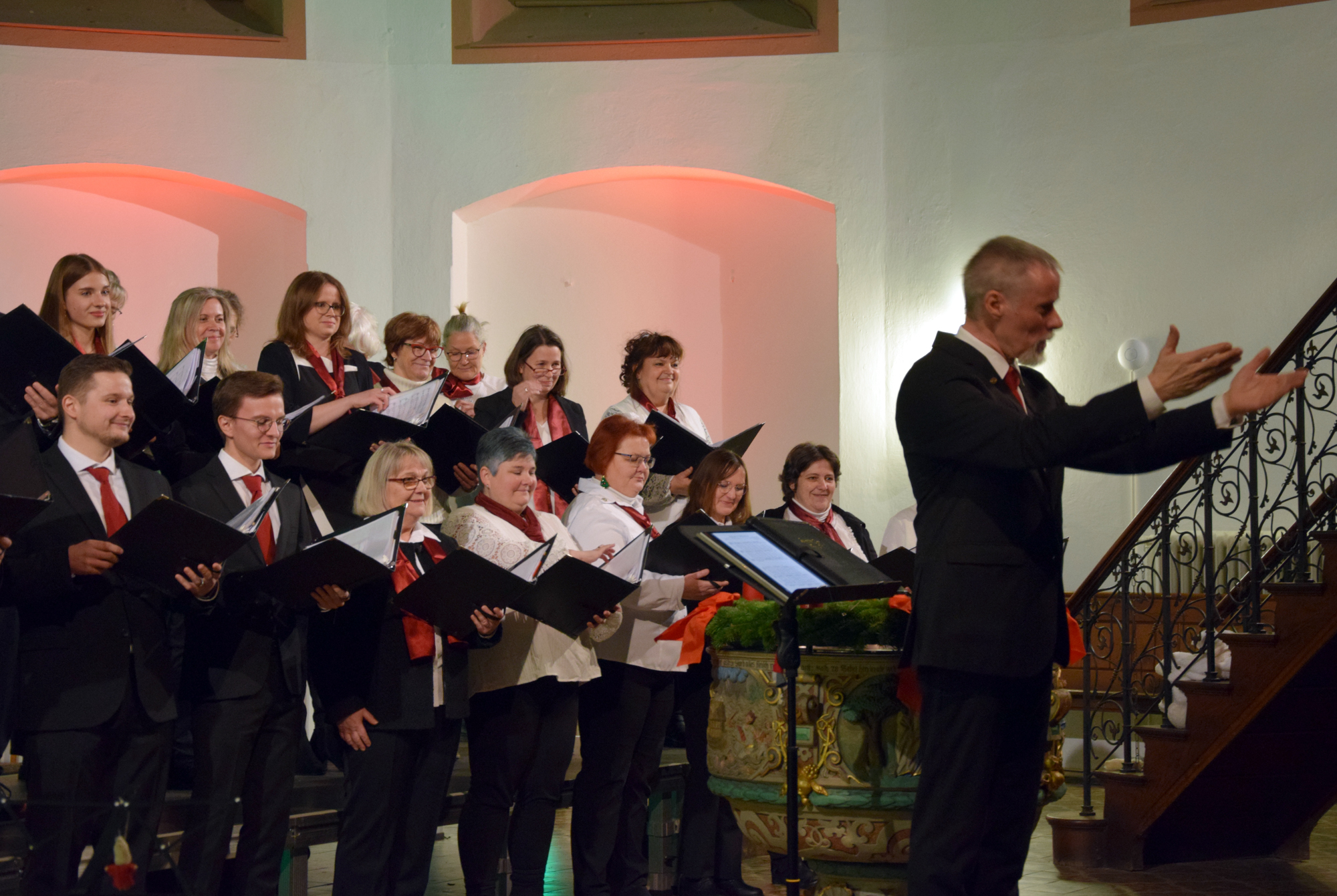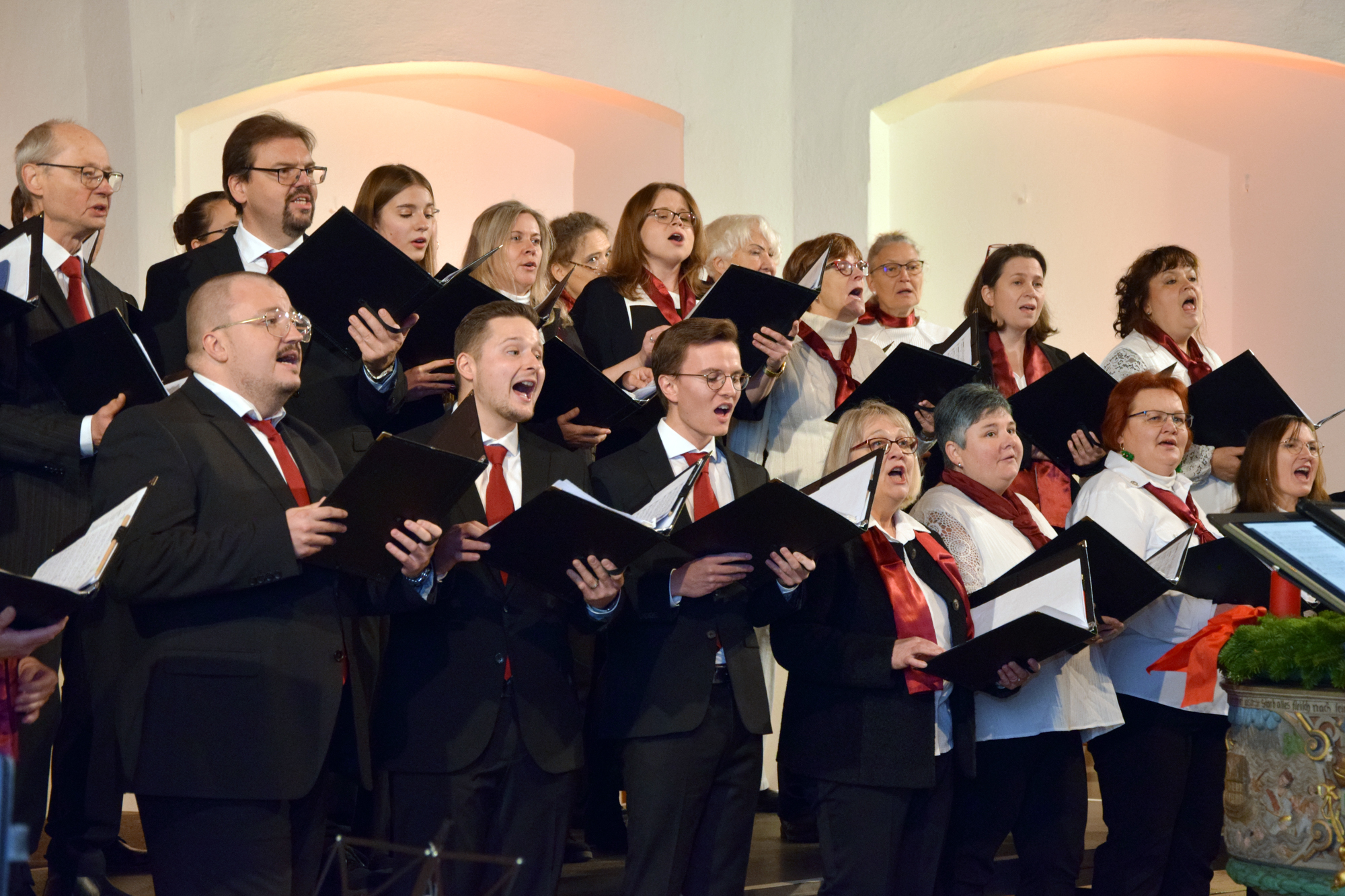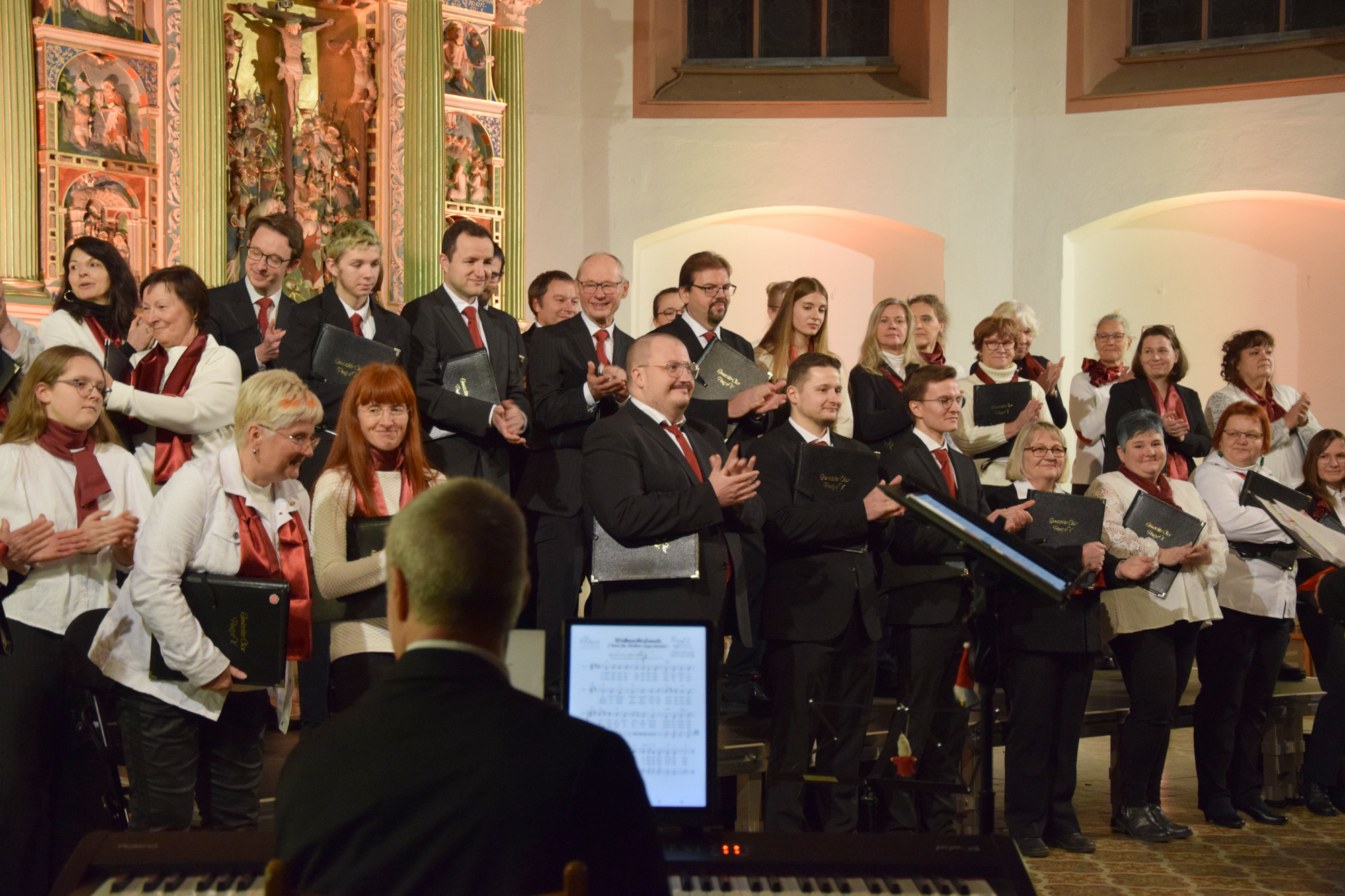 Das Konzertprogramm bot eine abwechslungsreiche Mischung aus Ensemblestücken, einem Gitarrenstück von unserem Bass-Sänger Marius, instrumental begleiteten Liedern, stimmungsvollen Kanons wie „Ding dong bells“ – bei dem das Publikum fröhlich mitsang – und natürlich vielen a cappella vorgetragenen Melodien. Neben bekannten Klassikern wie „Tausend Sterne sind ein Dom“ oder „Da pacem domine“ sorgte besonders unser neu einstudierter Chorsatz von „O Tannenbaum“ in einem Arrangement von Martin Carbow für Begeisterung. Als der letzte Ton verklungen war, würdigte das Publikum den Abend mit stehenden Ovationen. Die Stimmung gipfelte in einer gemeinsamen Zugabe: „Sind die Lichter angezündet“ – ein berührender Moment des Miteinanders, der den Abend unvergesslich machte.