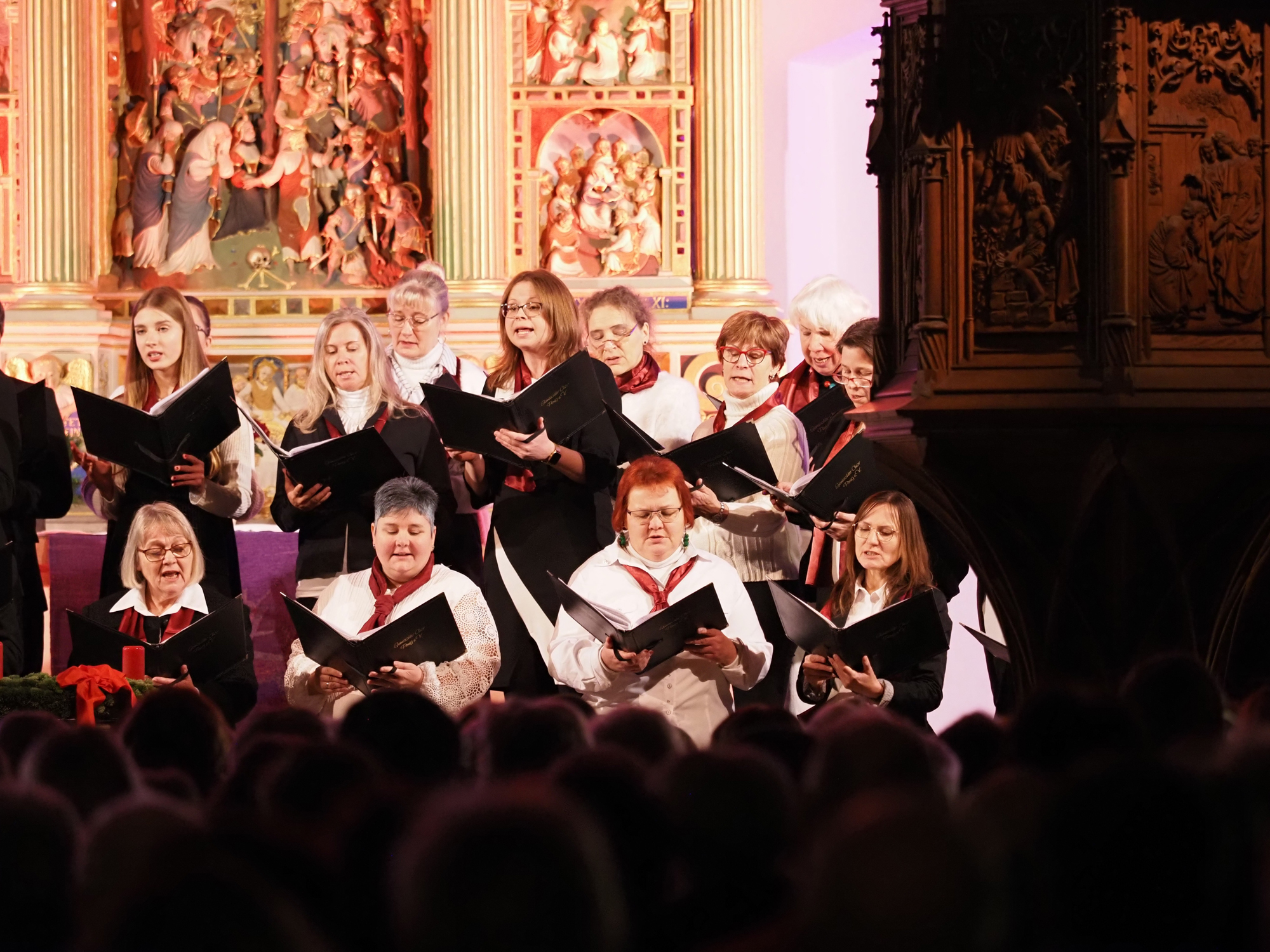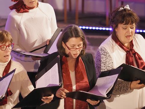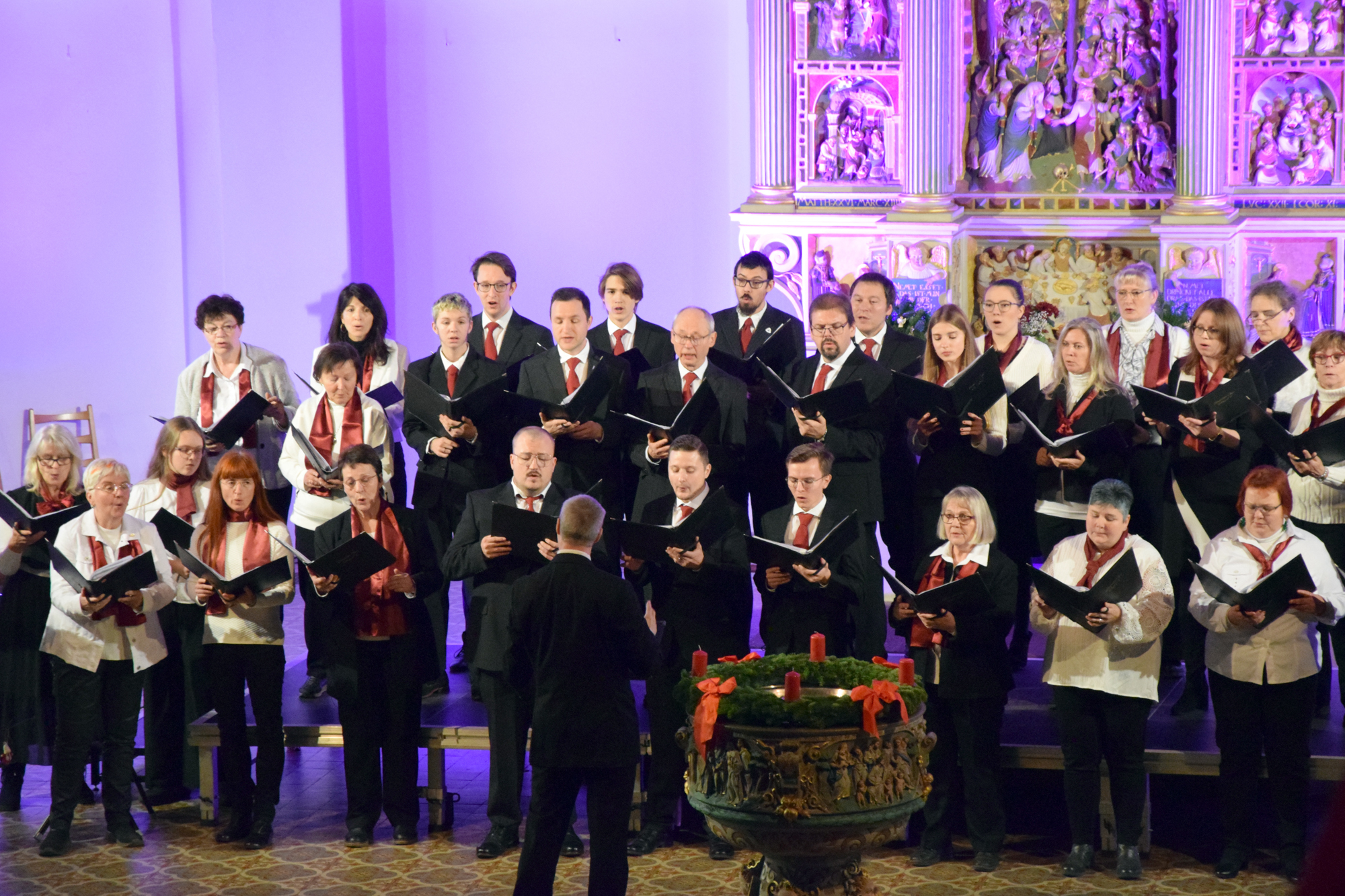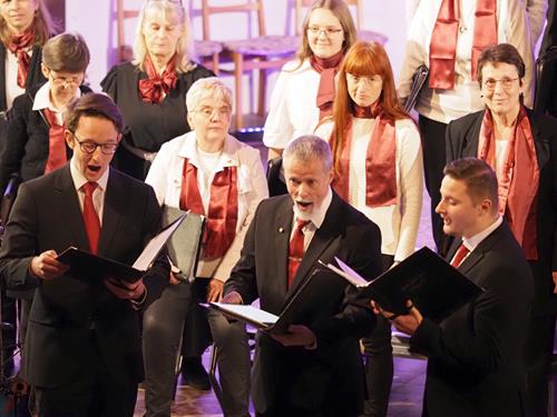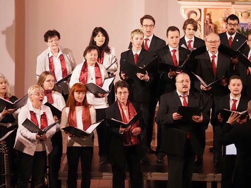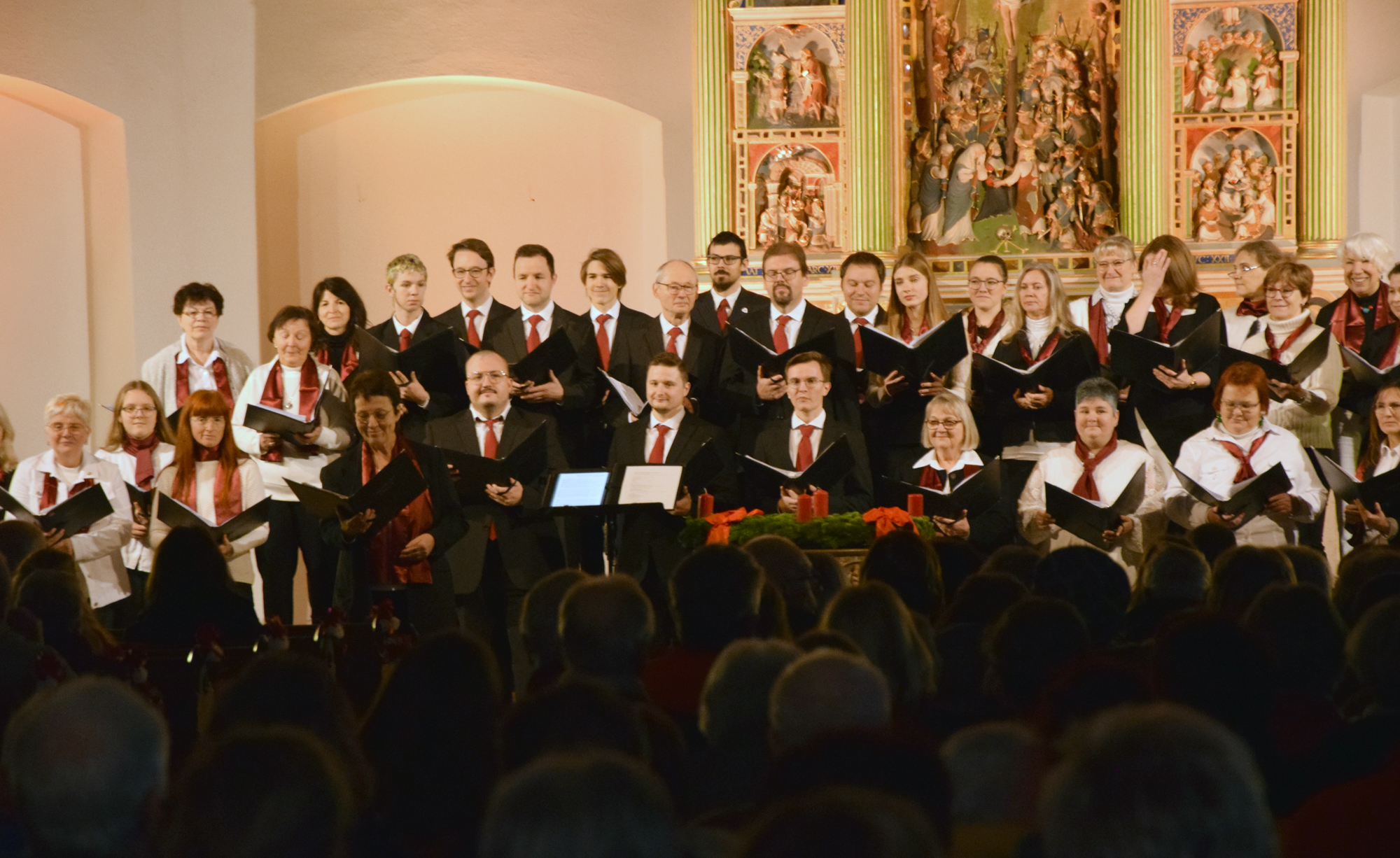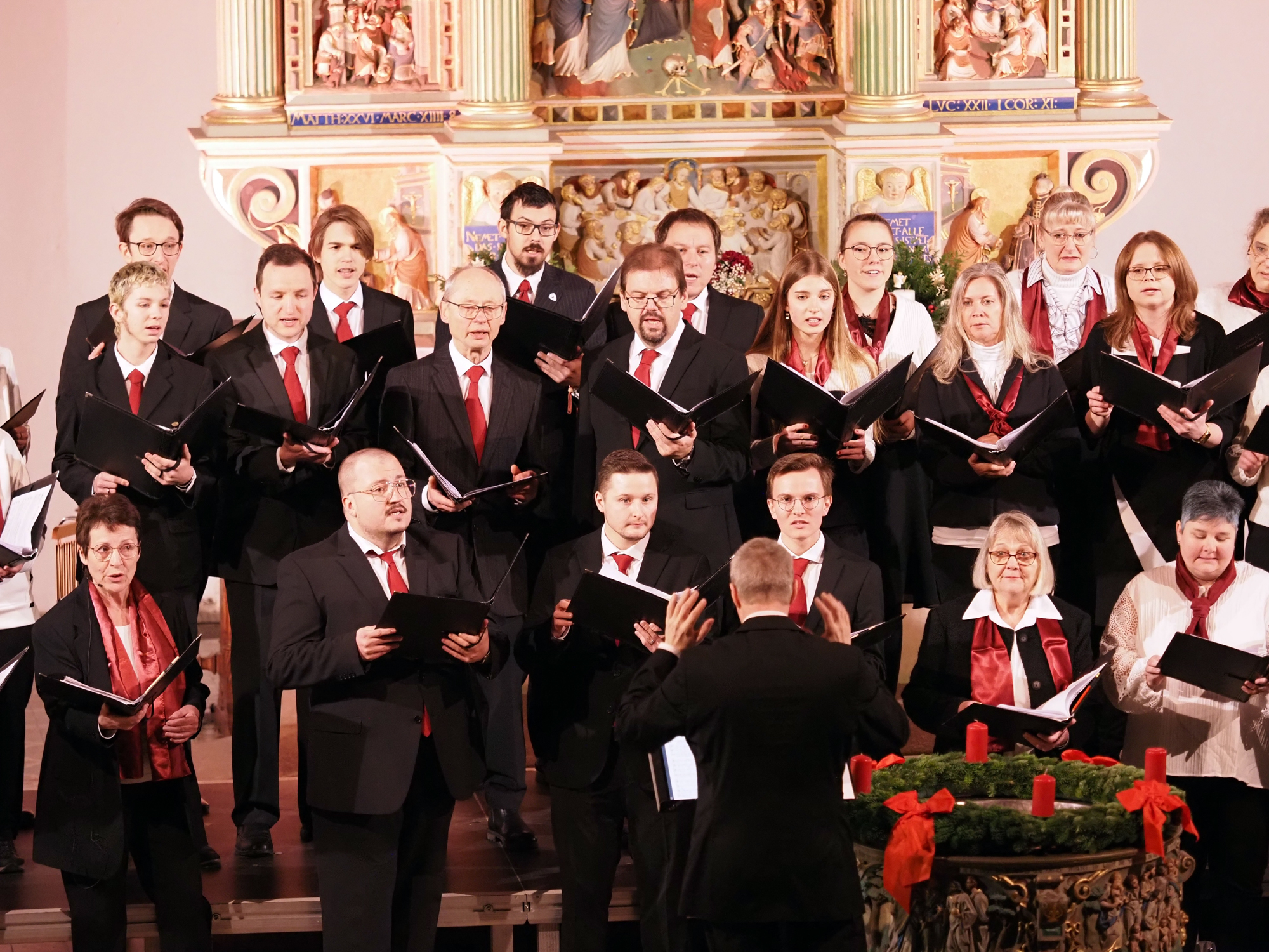 Das Konzertprogramm bot eine abwechslungsreiche Mischung aus Ensemblestücken, einem Gitarrenstück von unserem Bass-Sänger Marius, instrumental begleiteten Liedern, stimmungsvollen Kanons wie „Ding dong bells“ – bei dem das Publikum fröhlich mitsang – und natürlich vielen a cappella vorgetragenen Melodien. Neben bekannten Klassikern wie „Tausend Sterne sind ein Dom“ oder „Da pacem domine“ sorgte besonders unser neu einstudierter Chorsatz von „O Tannenbaum“ in einem Arrangement von Martin Carbow für Begeisterung. Als der letzte Ton verklungen war, würdigte das Publikum den Abend mit stehenden Ovationen. Die Stimmung gipfelte in einer gemeinsamen Zugabe: „Sind die Lichter angezündet“ – ein berührender Moment des Miteinanders, der den Abend unvergesslich machte.