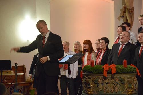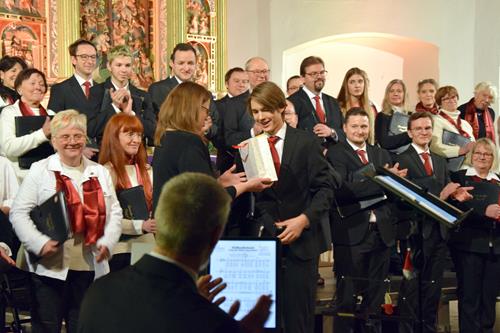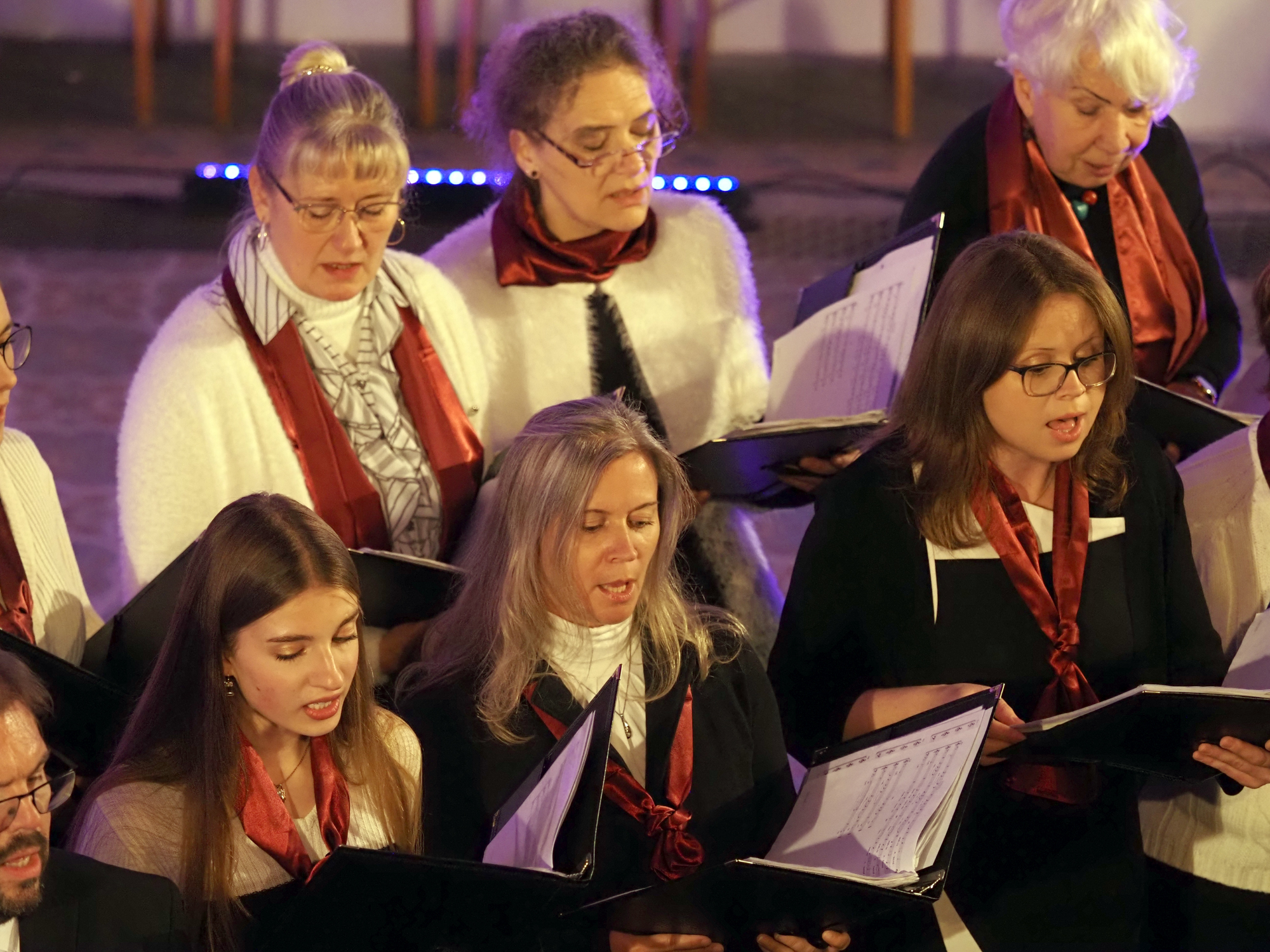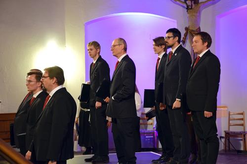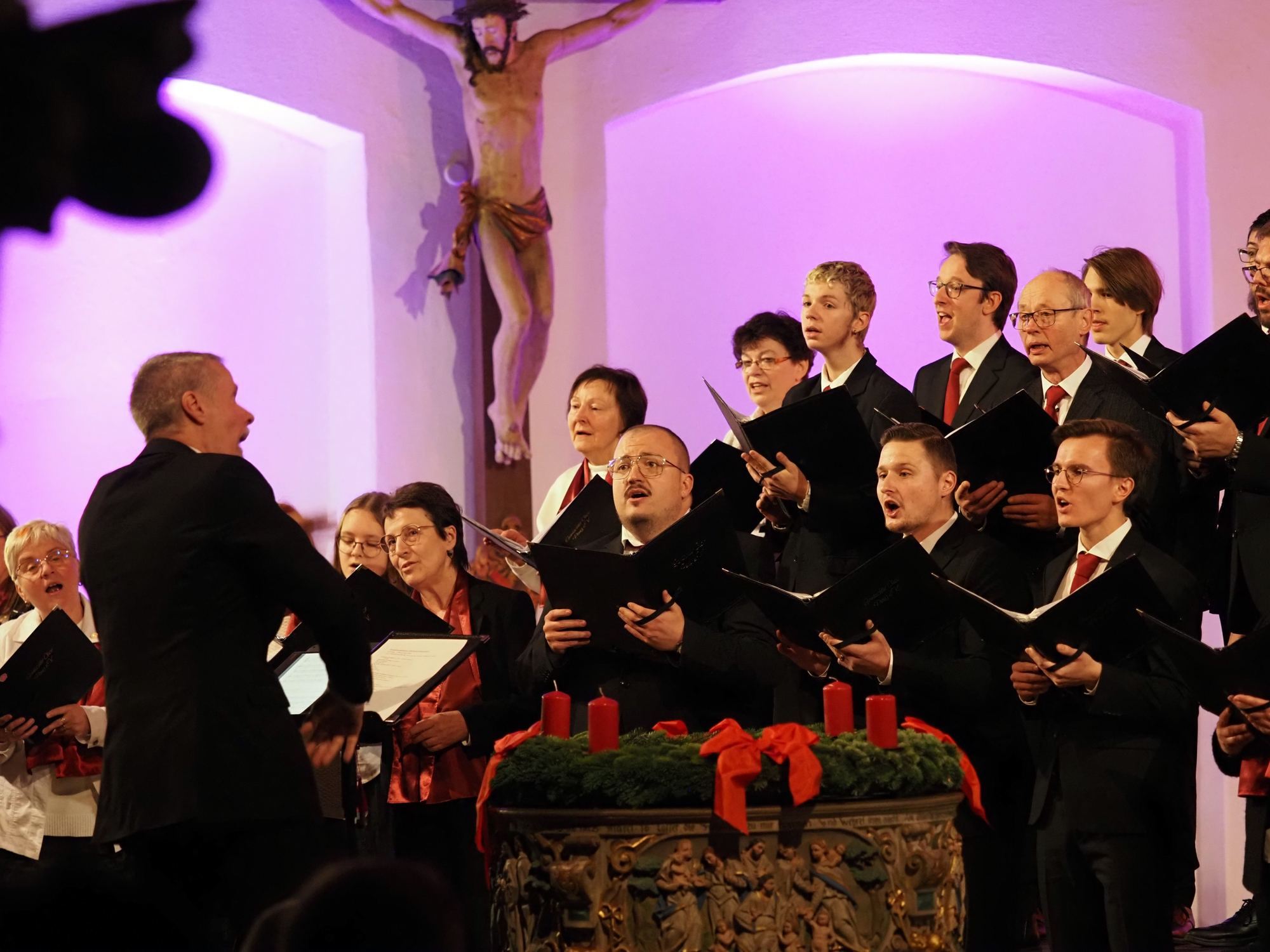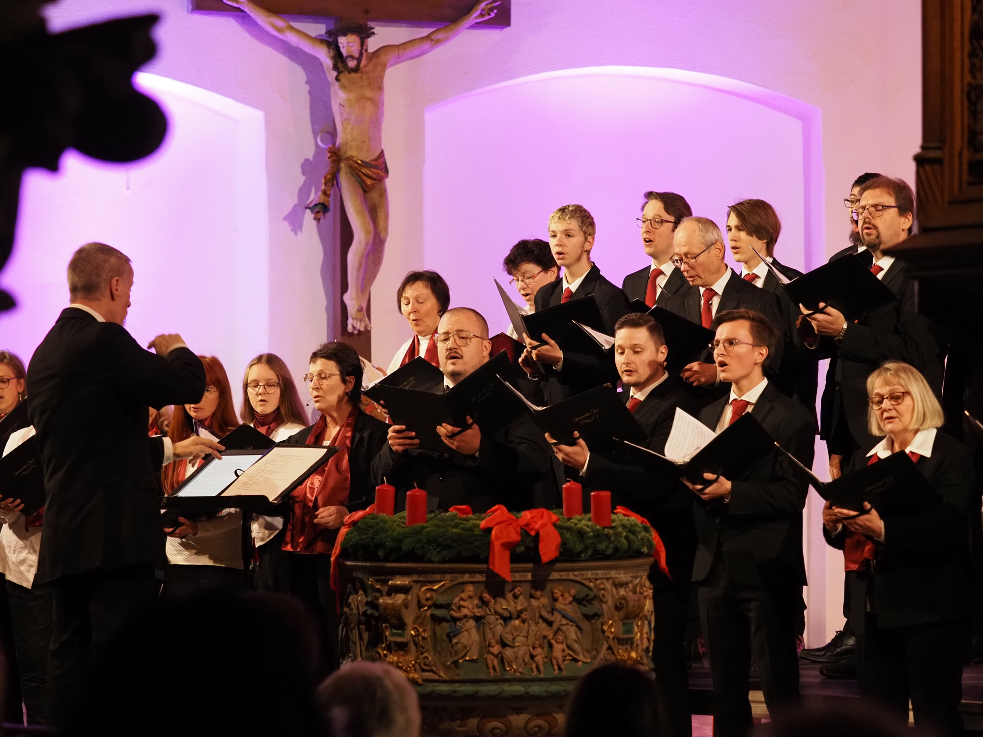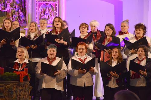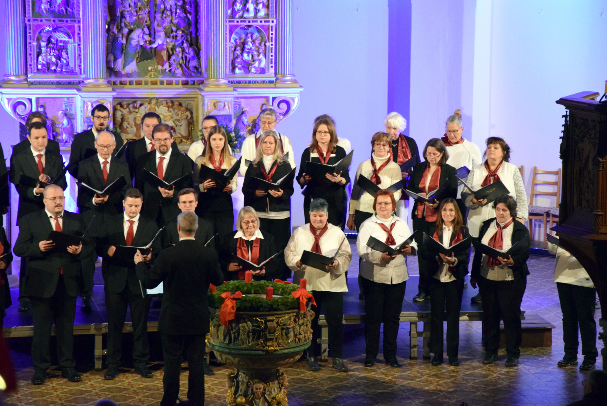 Das Konzertprogramm bot eine abwechslungsreiche Mischung aus Ensemblestücken, einem Gitarrenstück von unserem Bass-Sänger Marius, instrumental begleiteten Liedern, stimmungsvollen Kanons wie „Ding dong bells“ – bei dem das Publikum fröhlich mitsang – und natürlich vielen a cappella vorgetragenen Melodien. Neben bekannten Klassikern wie „Tausend Sterne sind ein Dom“ oder „Da pacem domine“ sorgte besonders unser neu einstudierter Chorsatz von „O Tannenbaum“ in einem Arrangement von Martin Carbow für Begeisterung. Als der letzte Ton verklungen war, würdigte das Publikum den Abend mit stehenden Ovationen. Die Stimmung gipfelte in einer gemeinsamen Zugabe: „Sind die Lichter angezündet“ – ein berührender Moment des Miteinanders, der den Abend unvergesslich machte.