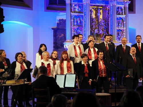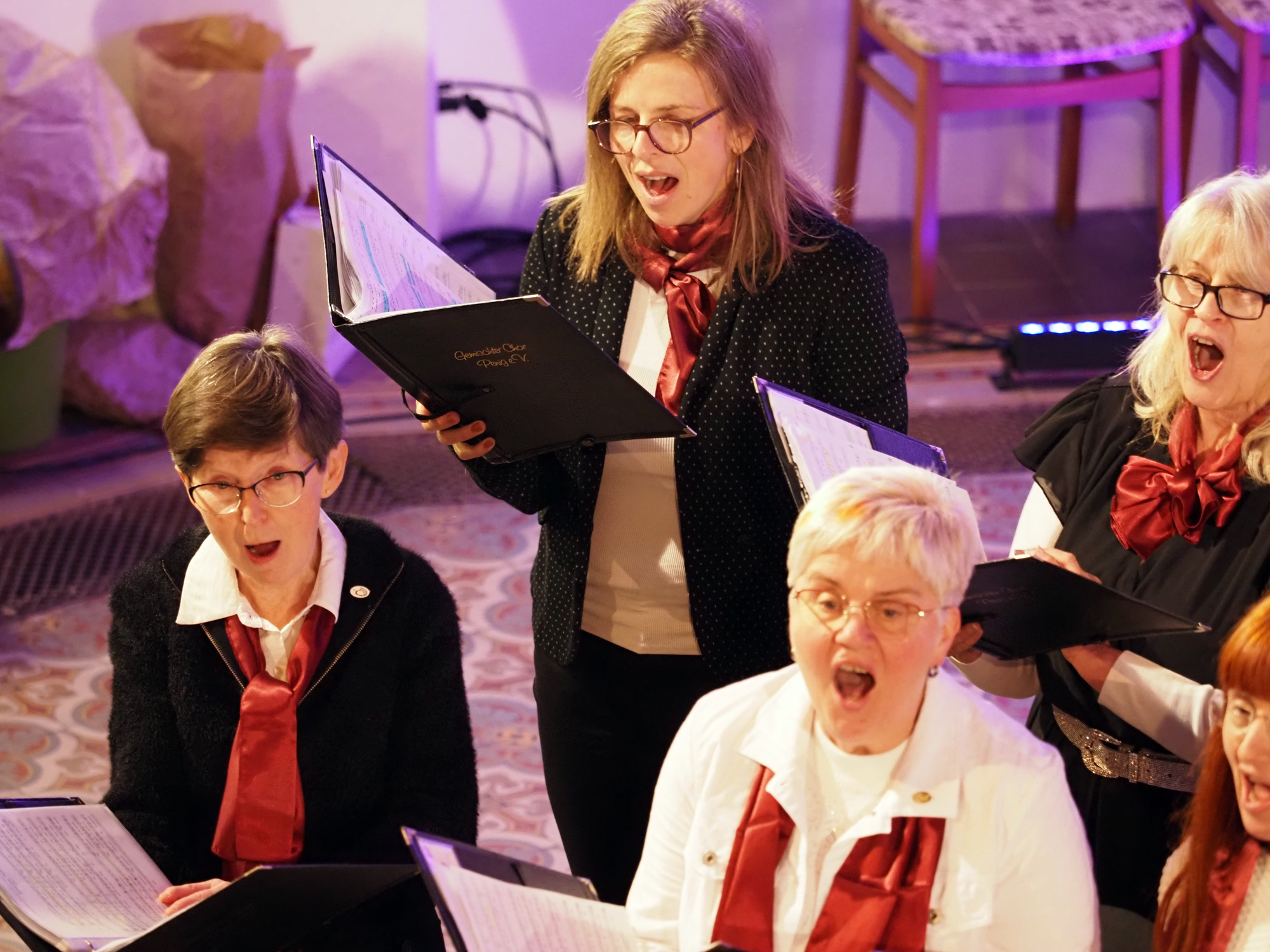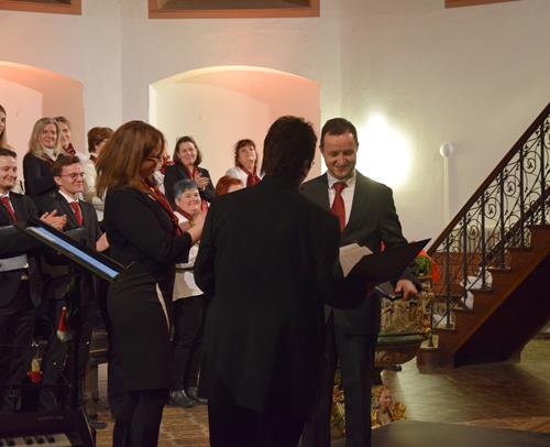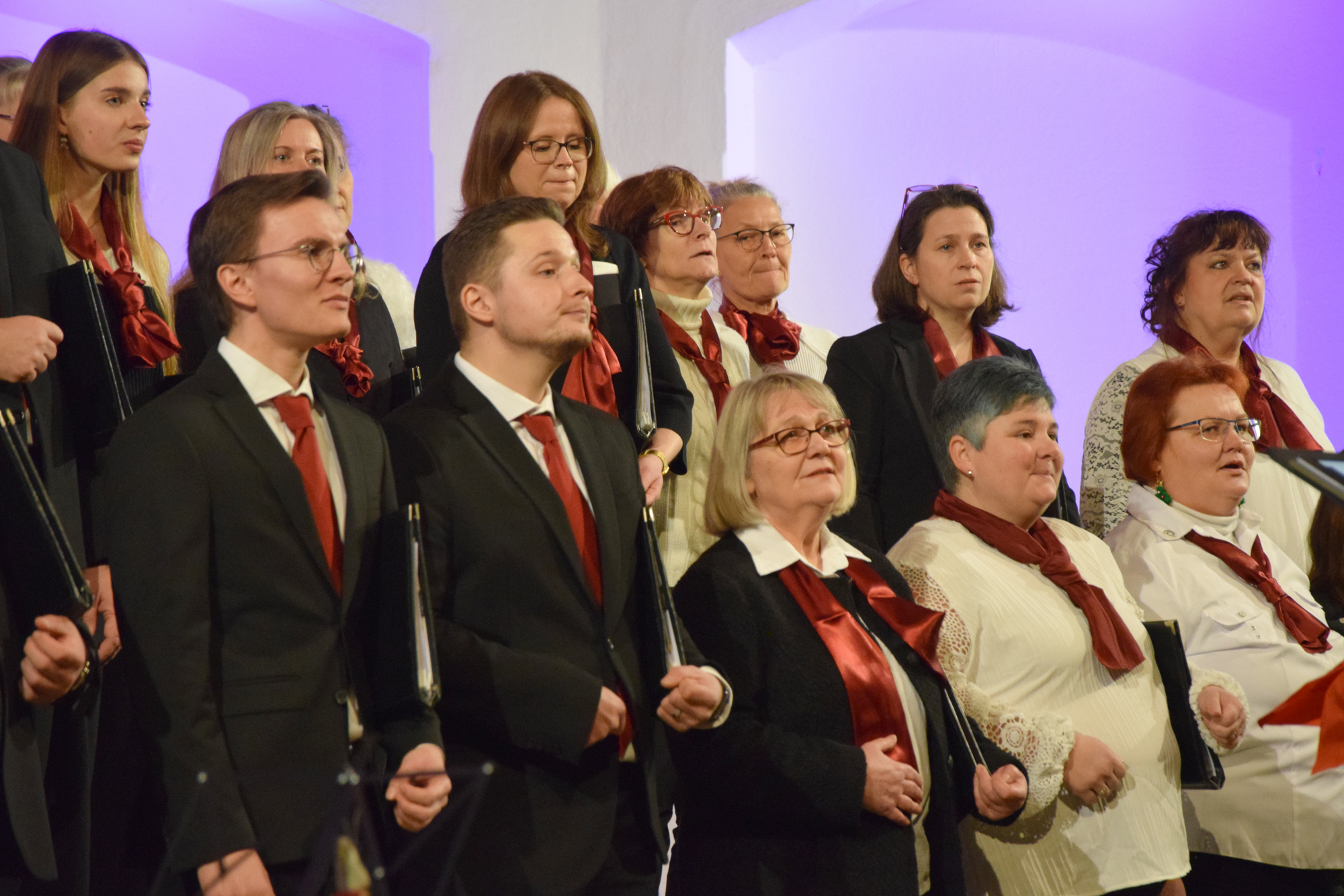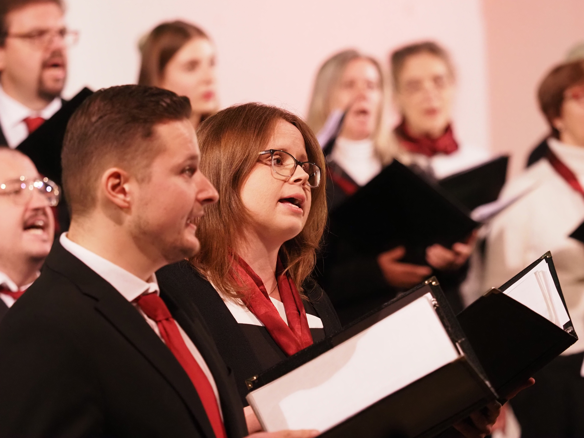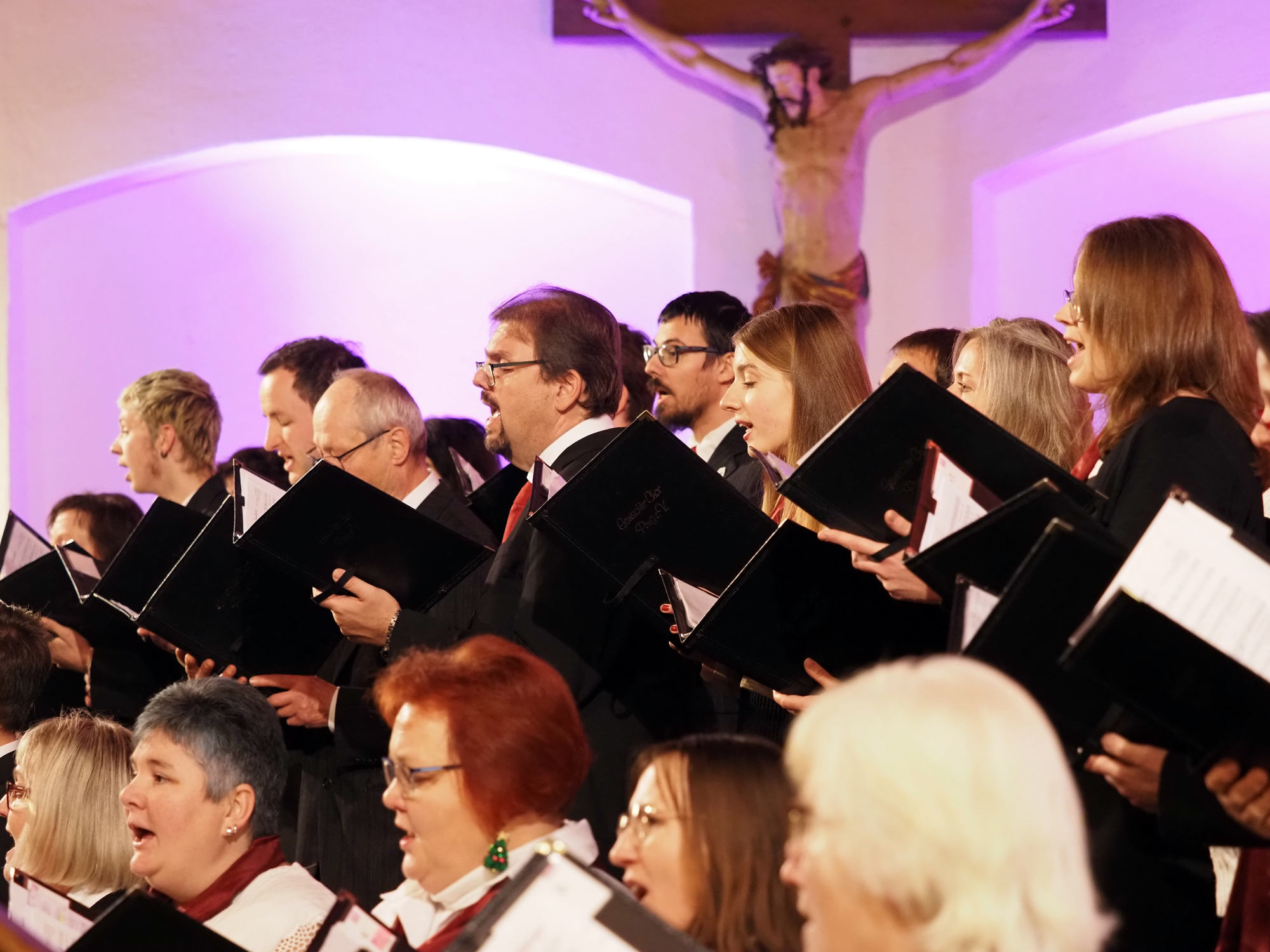 Das Konzertprogramm bot eine abwechslungsreiche Mischung aus Ensemblestücken, einem Gitarrenstück von unserem Bass-Sänger Marius, instrumental begleiteten Liedern, stimmungsvollen Kanons wie „Ding dong bells“ – bei dem das Publikum fröhlich mitsang – und natürlich vielen a cappella vorgetragenen Melodien. Neben bekannten Klassikern wie „Tausend Sterne sind ein Dom“ oder „Da pacem domine“ sorgte besonders unser neu einstudierter Chorsatz von „O Tannenbaum“ in einem Arrangement von Martin Carbow für Begeisterung. Als der letzte Ton verklungen war, würdigte das Publikum den Abend mit stehenden Ovationen. Die Stimmung gipfelte in einer gemeinsamen Zugabe: „Sind die Lichter angezündet“ – ein berührender Moment des Miteinanders, der den Abend unvergesslich machte.