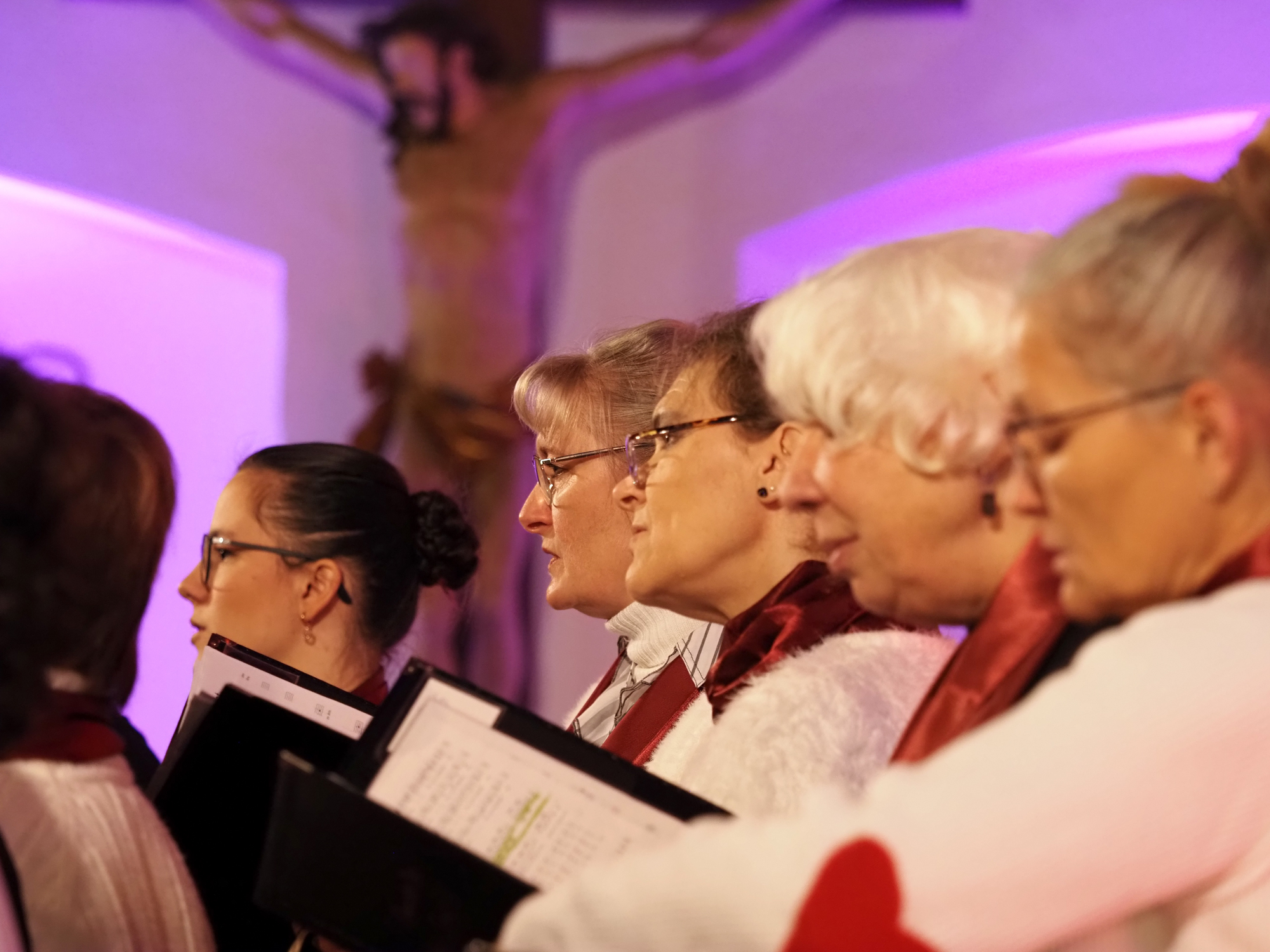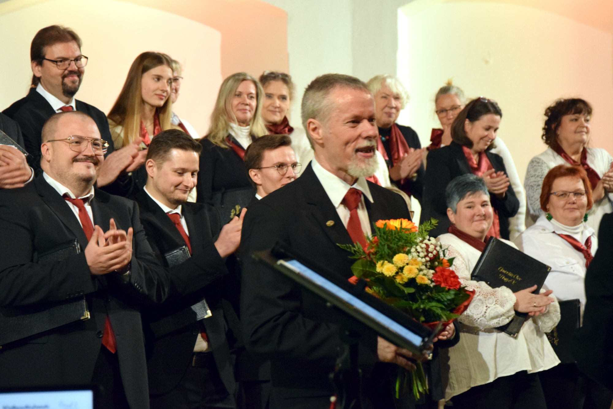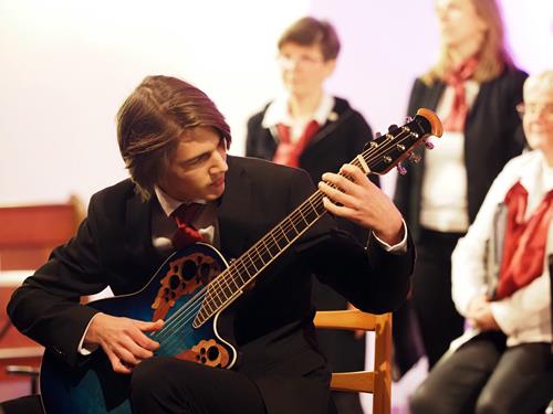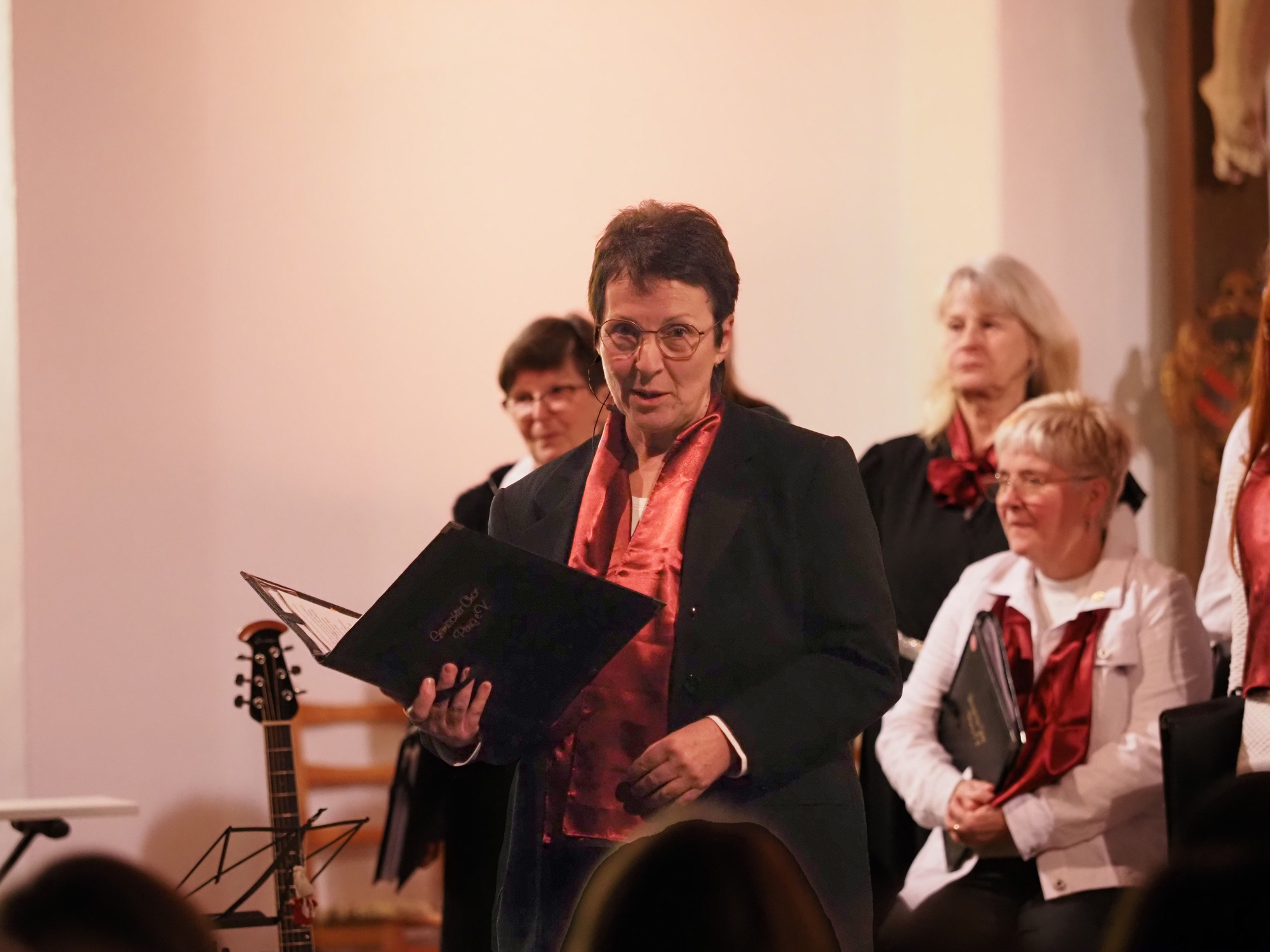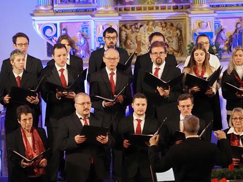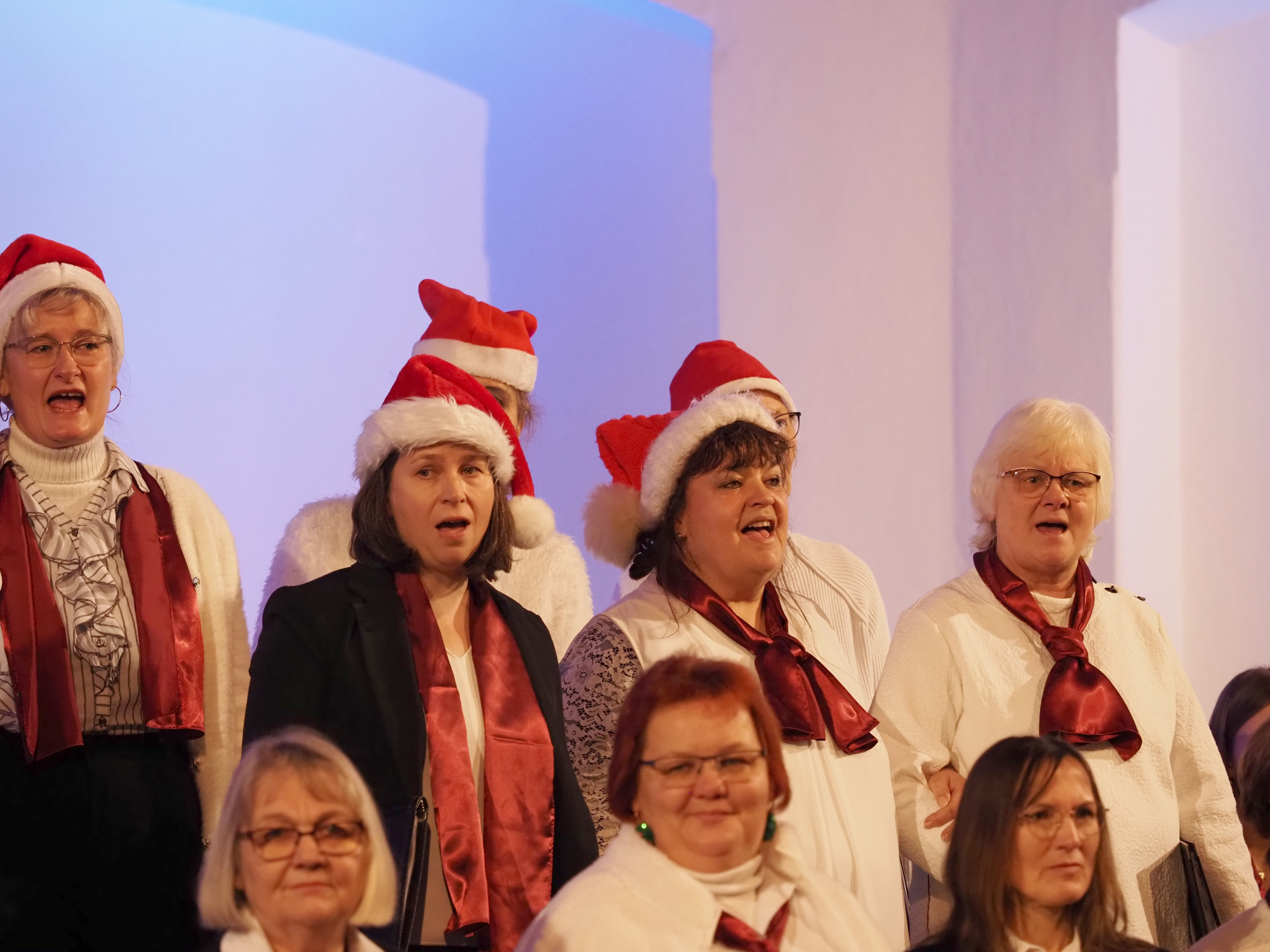 Das Konzertprogramm bot eine abwechslungsreiche Mischung aus Ensemblestücken, einem Gitarrenstück von unserem Bass-Sänger Marius, instrumental begleiteten Liedern, stimmungsvollen Kanons wie „Ding dong bells“ – bei dem das Publikum fröhlich mitsang – und natürlich vielen a cappella vorgetragenen Melodien. Neben bekannten Klassikern wie „Tausend Sterne sind ein Dom“ oder „Da pacem domine“ sorgte besonders unser neu einstudierter Chorsatz von „O Tannenbaum“ in einem Arrangement von Martin Carbow für Begeisterung. Als der letzte Ton verklungen war, würdigte das Publikum den Abend mit stehenden Ovationen. Die Stimmung gipfelte in einer gemeinsamen Zugabe: „Sind die Lichter angezündet“ – ein berührender Moment des Miteinanders, der den Abend unvergesslich machte.