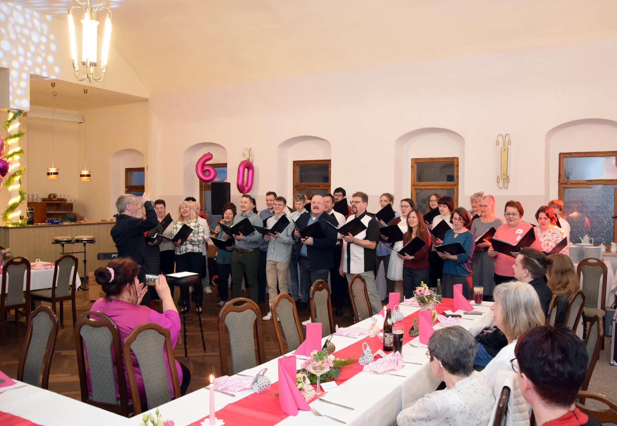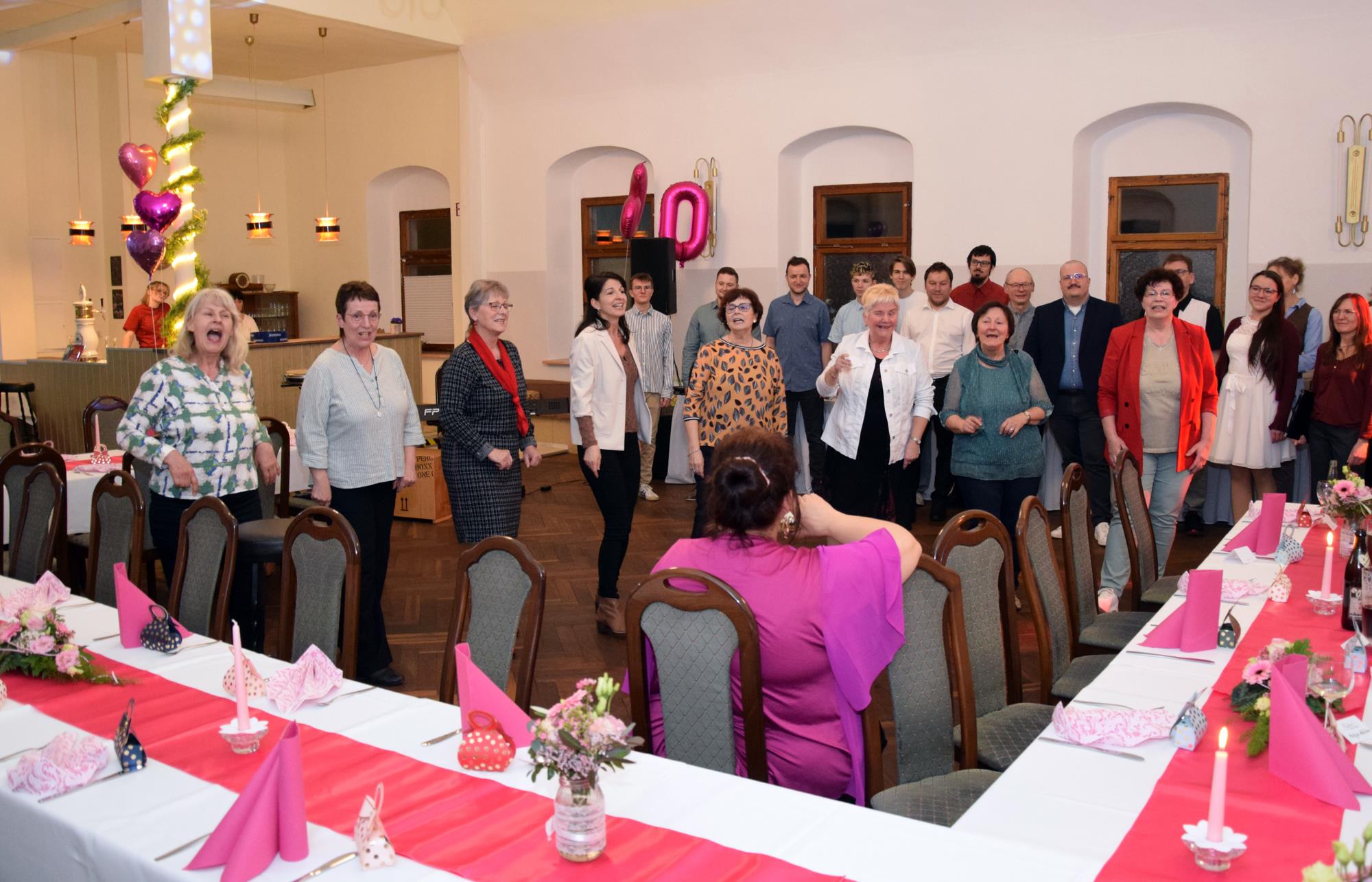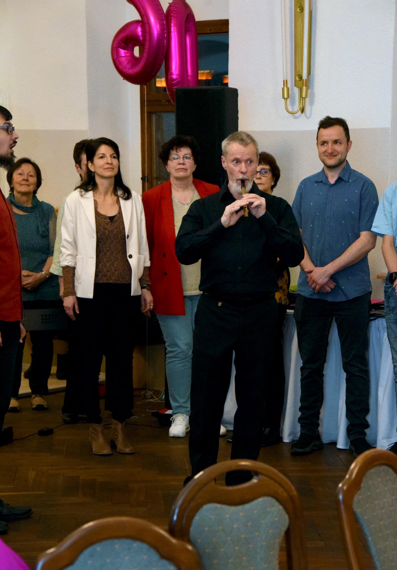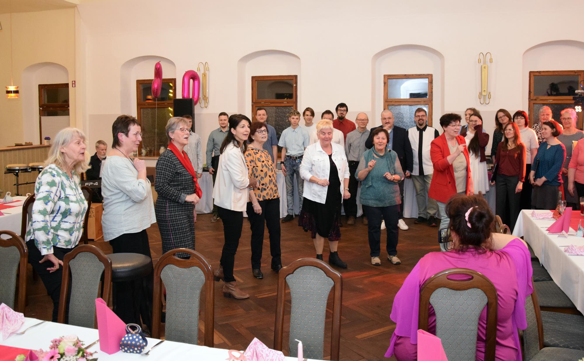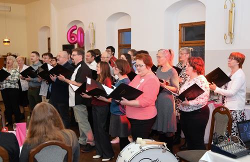 Wenn ein so wertvolles Chormitglied einen runden Geburtstag feiert, bereitet es uns besonders große Freude, diese Party mit einem kleinen Privatkonzert, gespickt mit den Lieblings- und ein paar Überraschungsliedern der Jubilarin, zu bereichern. Dazu gehören unter anderem „Auf der Suche“ und „Die Stimme kann's“ – beides Stücke vom Komponisten und Songwriter Oliver Gies, welche das Geburtstagskind offensichtlich ganz besonders schätzt. Mit den Liedern „Shake the bottle“ und „Klingende Speisekarte“ brachten wir Schwung und Spaß in unseren Auftritt, während das von Paul und Leonie vorgetragene „You raise me up“ für sehr berührende Momente sorgte. Bei „Bring me little water, Sylvie“ ließ es sich Simone nicht nehmen, den Zuhörerplatz in der ersten Reihe aufzugeben, sich zu ihren Sopranistinnen zu stellen und selbst mitzusingen und zu tanzen. Herrlich!