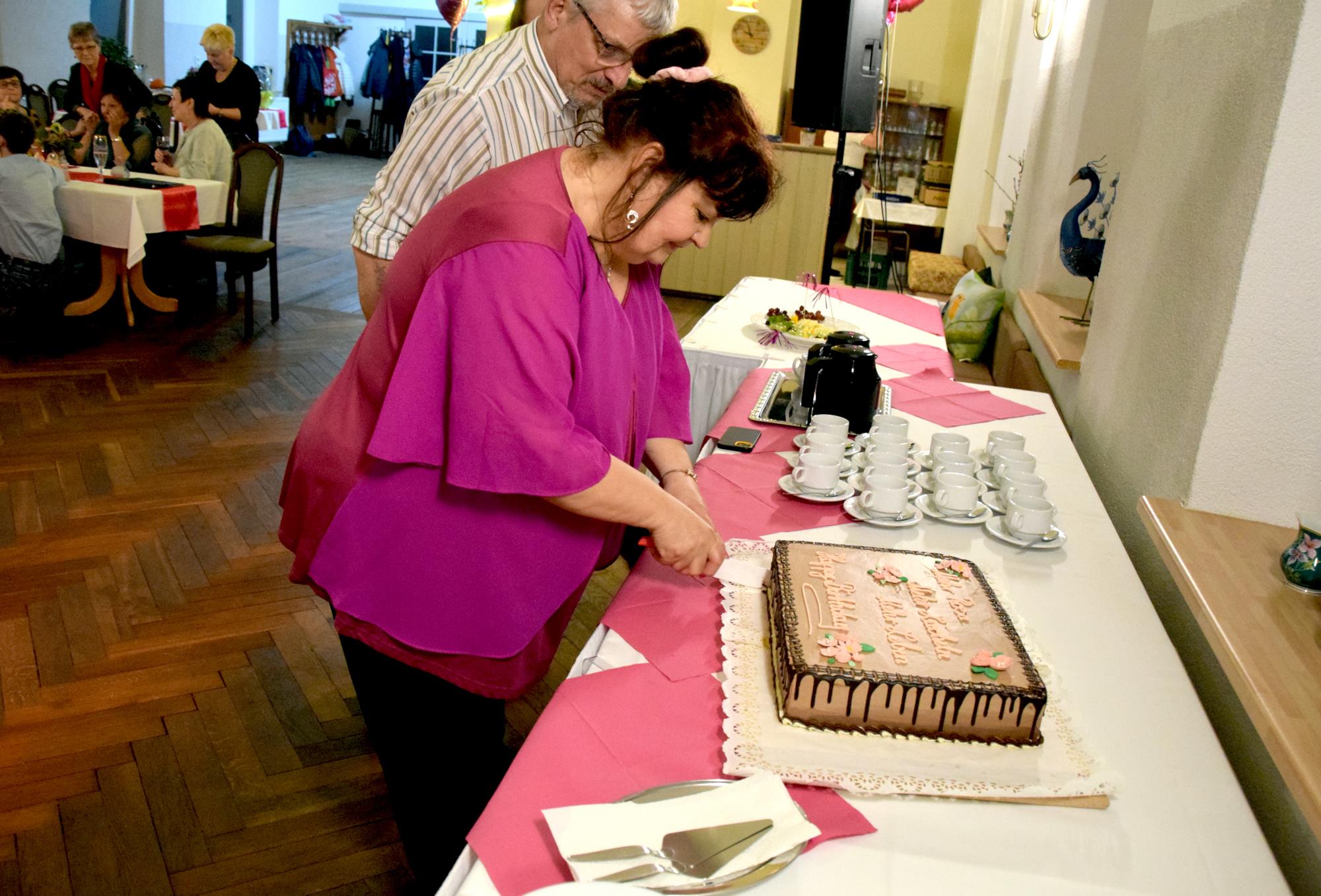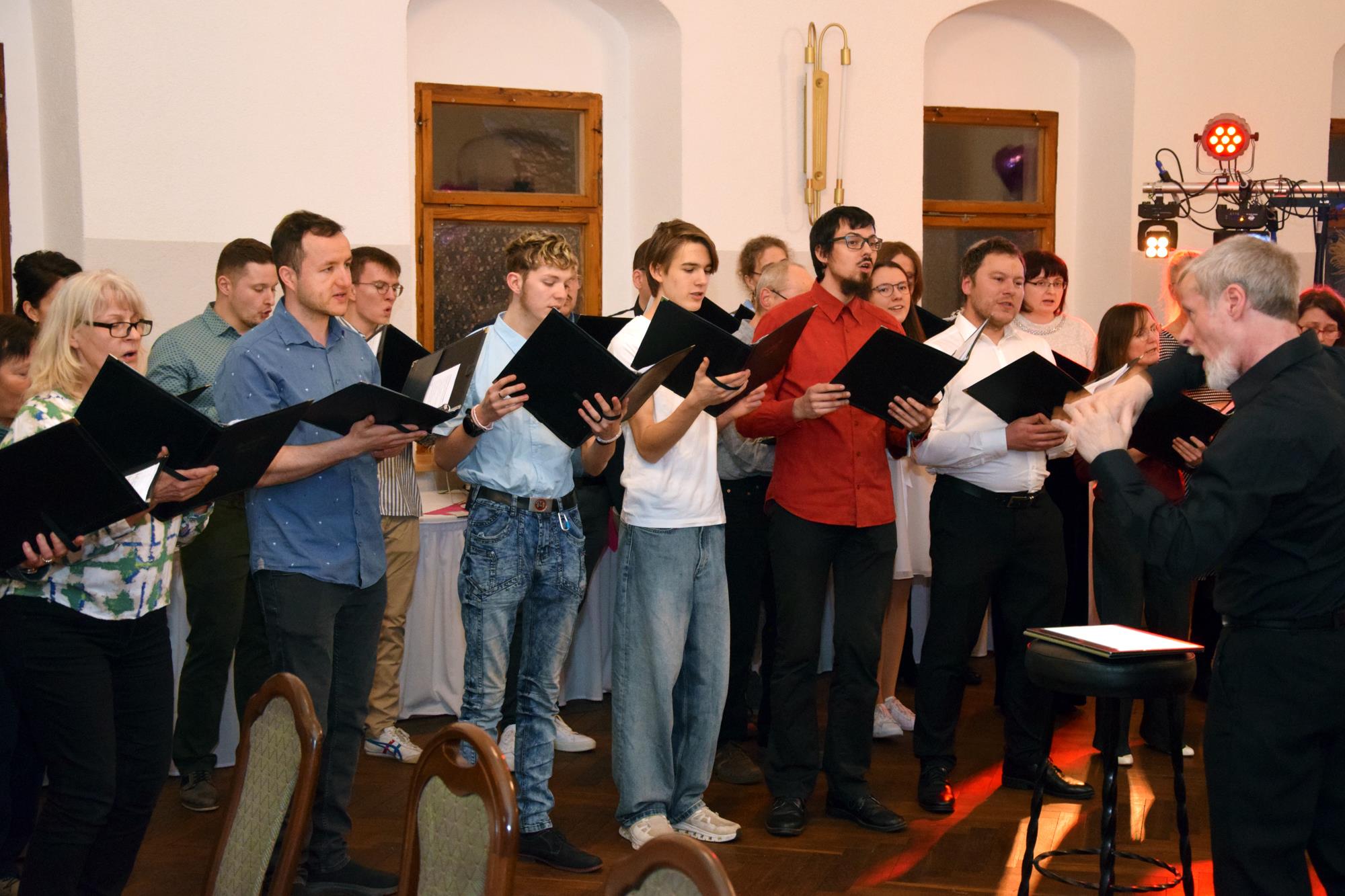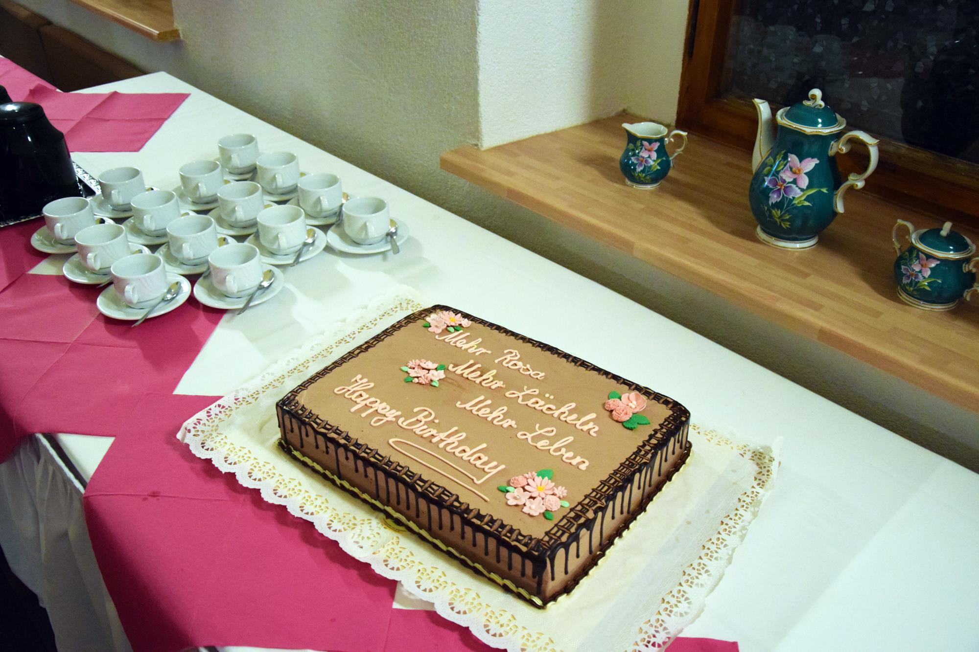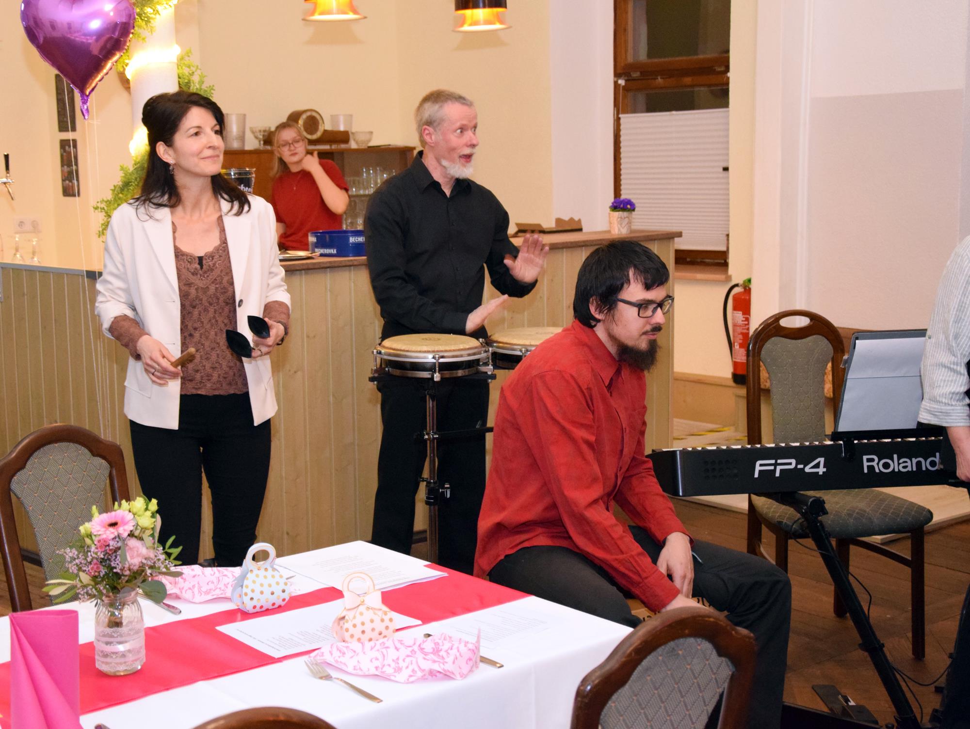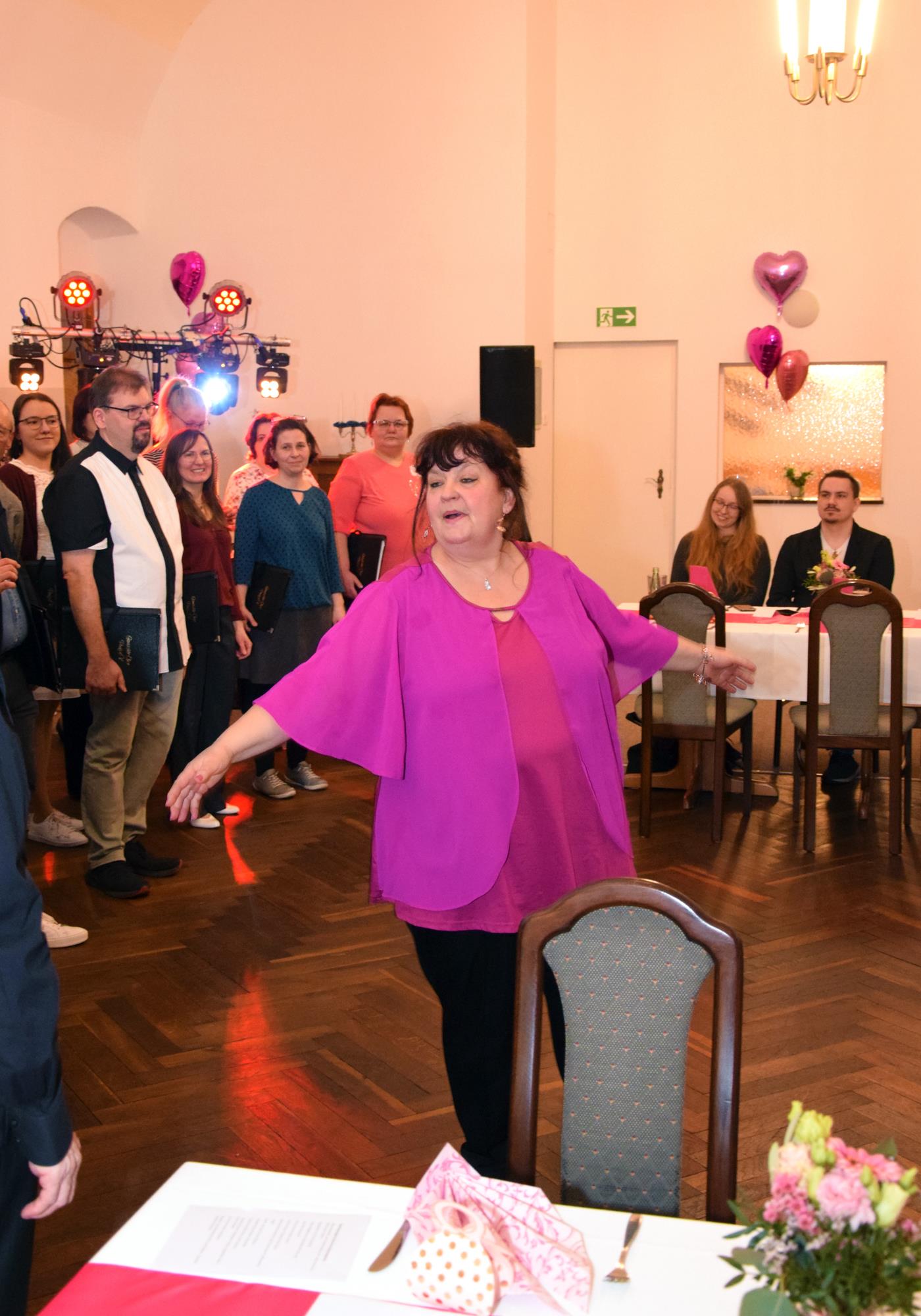 Wenn ein so wertvolles Chormitglied einen runden Geburtstag feiert, bereitet es uns besonders große Freude, diese Party mit einem kleinen Privatkonzert, gespickt mit den Lieblings- und ein paar Überraschungsliedern der Jubilarin, zu bereichern. Dazu gehören unter anderem „Auf der Suche“ und „Die Stimme kann's“ – beides Stücke vom Komponisten und Songwriter Oliver Gies, welche das Geburtstagskind offensichtlich ganz besonders schätzt. Mit den Liedern „Shake the bottle“ und „Klingende Speisekarte“ brachten wir Schwung und Spaß in unseren Auftritt, während das von Paul und Leonie vorgetragene „You raise me up“ für sehr berührende Momente sorgte. Bei „Bring me little water, Sylvie“ ließ es sich Simone nicht nehmen, den Zuhörerplatz in der ersten Reihe aufzugeben, sich zu ihren Sopranistinnen zu stellen und selbst mitzusingen und zu tanzen. Herrlich!